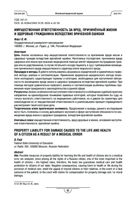 Цель. Анализ возможных мер имущественной ответственности за причинение вреди жизни и здоровью граждан вследствие врачебной ошибки. Негативные последствия, причинение вреда здоровью или жизни при оказание медицинской помощи влечёт обращение пострадавших граждан или их родственников, в случае летального исхода пациента, в суд с требованиями возмещения причиненного вреда имущественного характера и/или морального вреда.
