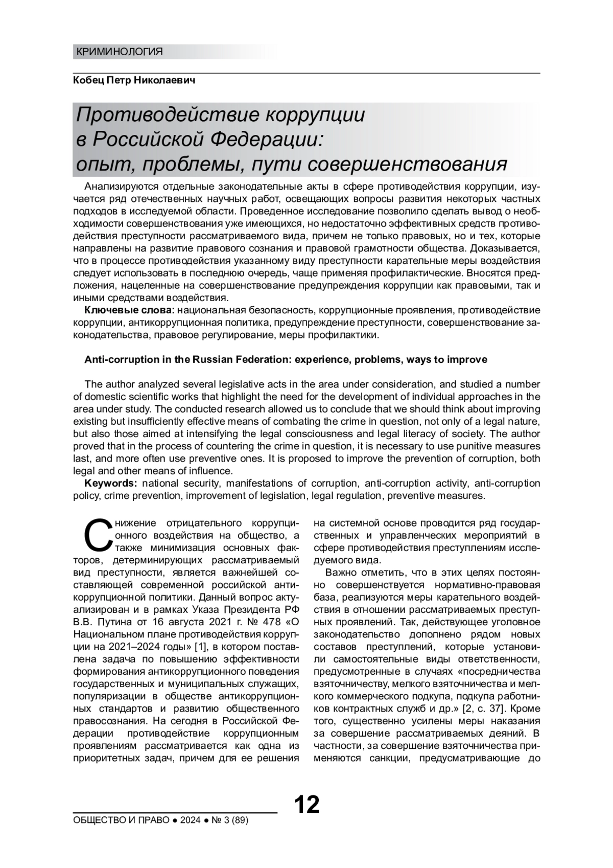 КОБЕЦ П. Н. ПРОТИВОДЕЙСТВИЕ КОРРУПЦИИ В РОССИЙСКОЙ ФЕДЕРАЦИИ: ОПЫТ, ПРОБЛЕМЫ, ПУТИ СОВЕРШЕНСТВОВАНИЯ // ОБЩЕСТВО И ПРАВО. 2024. № 3 (89)