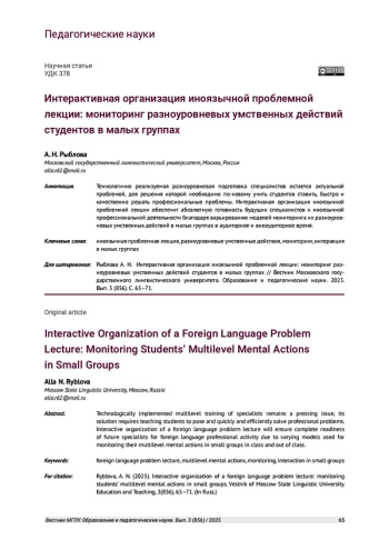 РЫБЛОВА А. Н. ИНТЕРАКТИВНАЯ ОРГАНИЗАЦИЯ ИНОЯЗЫЧНОЙ ПРОБЛЕМНОЙ ЛЕКЦИИ: МОНИТОРИНГ РАЗНОУРОВНЕВЫХ УМСТВЕННЫХ ДЕЙСТВИЙ СТУДЕНТОВ В МАЛЫХ ГРУППАХ // ВЕСТНИК МОСКОВСКОГО ГОСУДАРСТВЕННОГО ЛИНГВИСТИЧЕСКОГО УНИВЕРСИТЕТА. ОБРАЗОВАНИЕ И ПЕДАГОГИЧЕСКИЕ НАУКИ. 2025. № 3 (856)