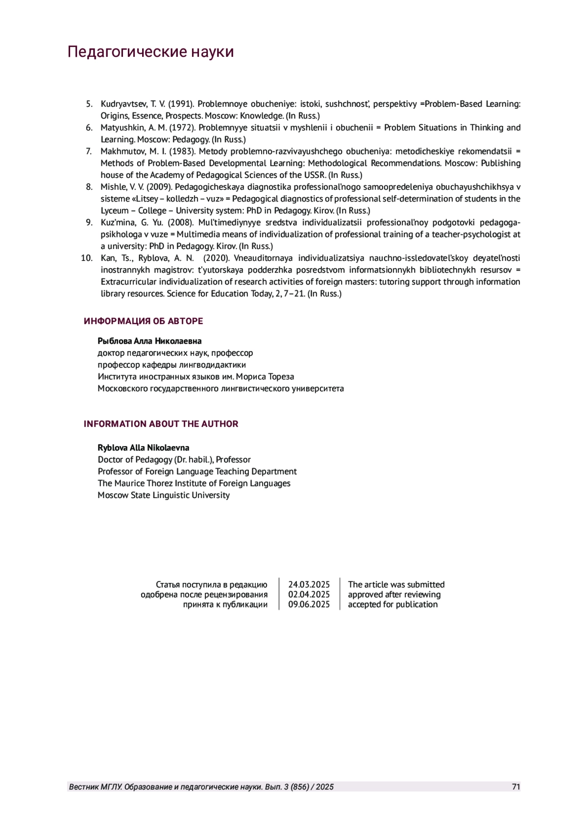 Журнал: ВЕСТНИК МОСКОВСКОГО ГОСУДАРСТВЕННОГО ЛИНГВИСТИЧЕСКОГО УНИВЕРСИТЕТА. ОБРАЗОВАНИЕ И ПЕДАГОГИЧЕСКИЕ НАУКИ