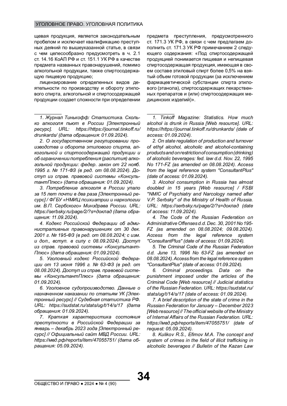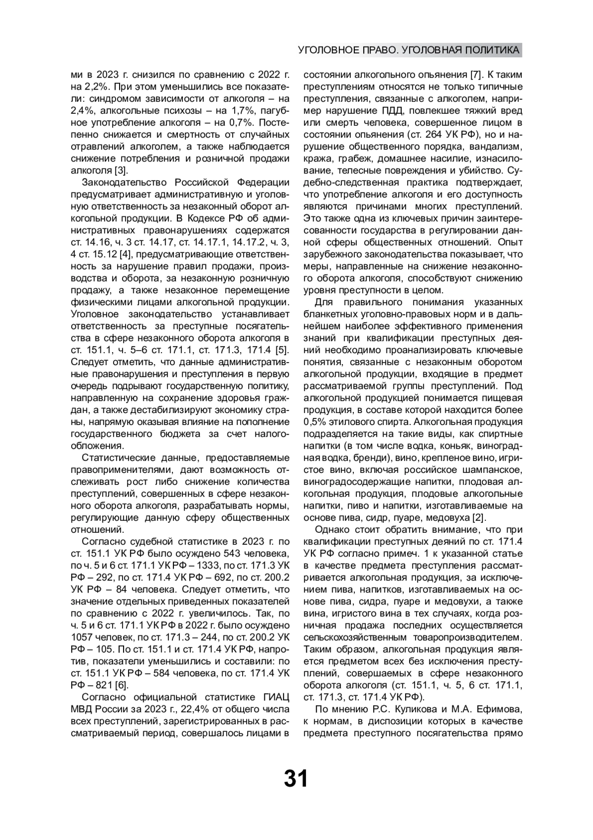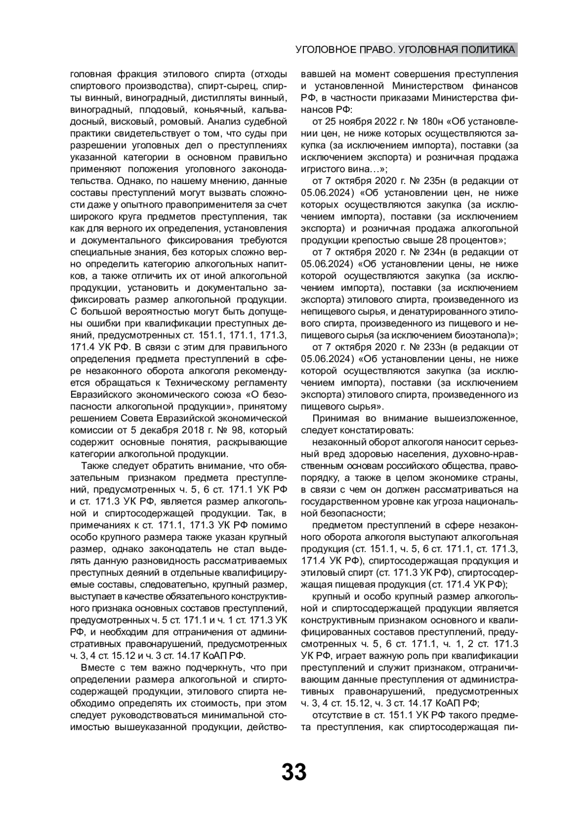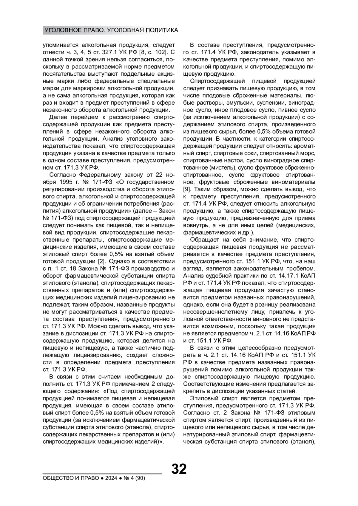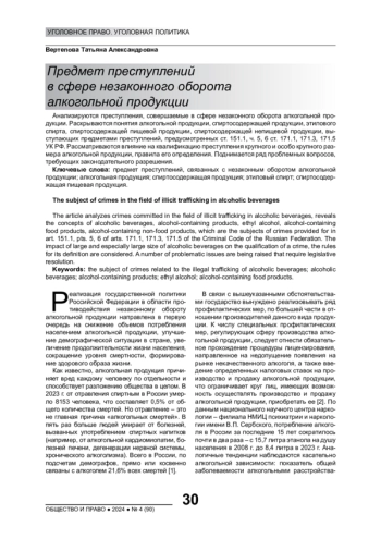 Статья: ПРЕДМЕТ ПРЕСТУПЛЕНИЙ В СФЕРЕ НЕЗАКОННОГО ОБОРОТА АЛКОГОЛЬНОЙ ПРОДУКЦИИ (2024)