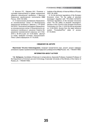 ВЕРТЕПОВА Т. А. ПРЕДМЕТ ПРЕСТУПЛЕНИЙ В СФЕРЕ НЕЗАКОННОГО ОБОРОТА АЛКОГОЛЬНОЙ ПРОДУКЦИИ // ОБЩЕСТВО И ПРАВО. 2024. № 4 (90)