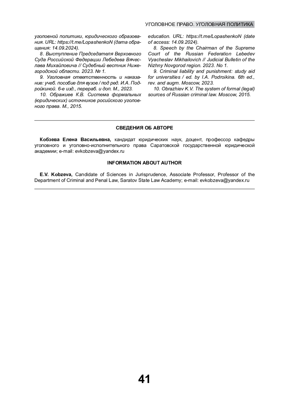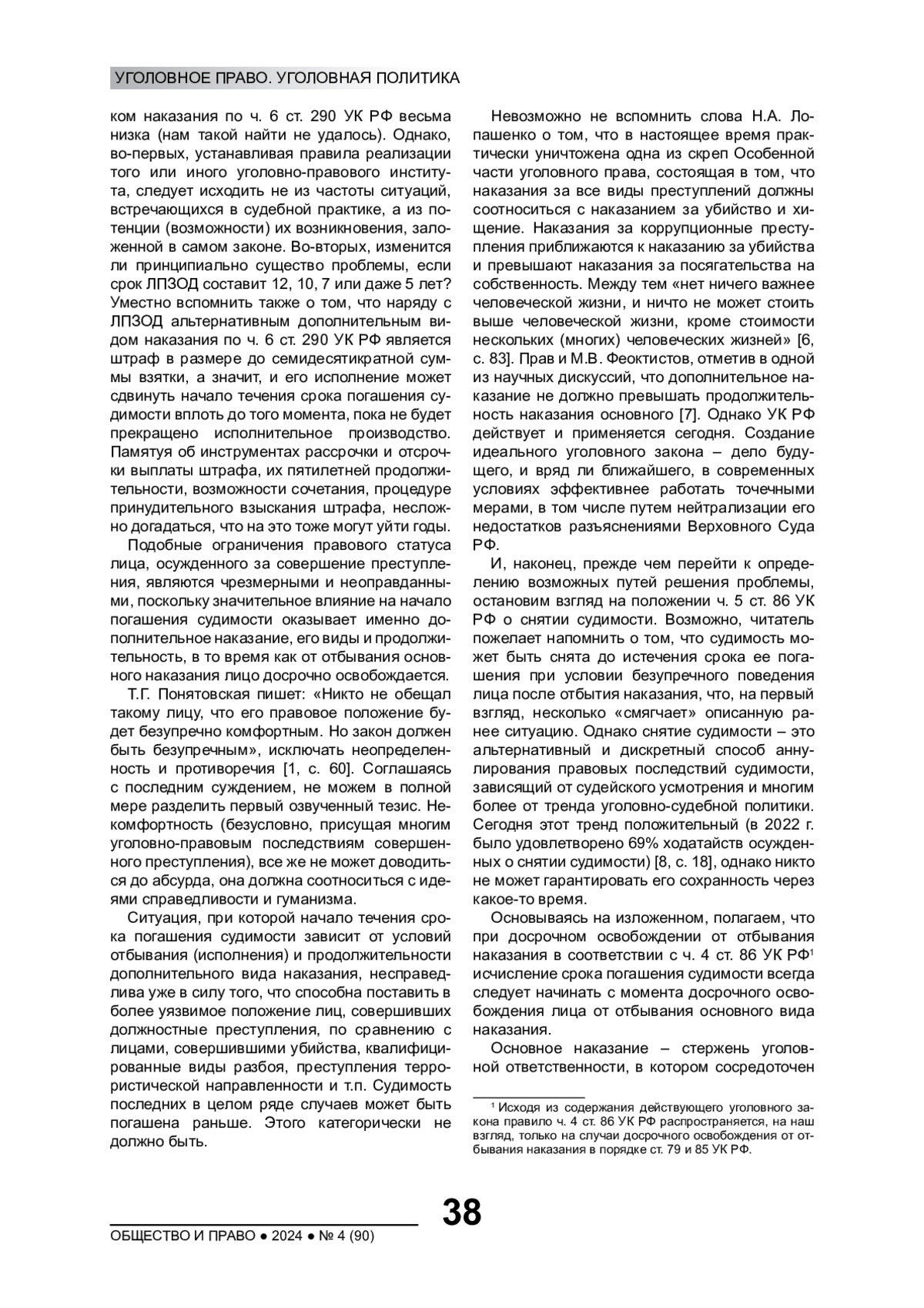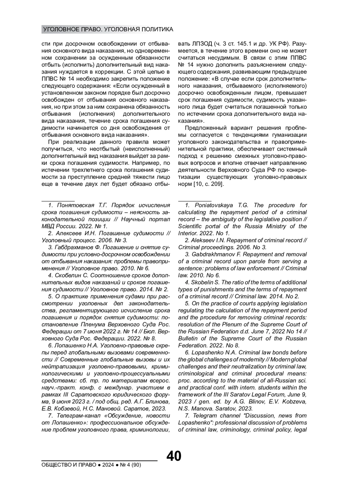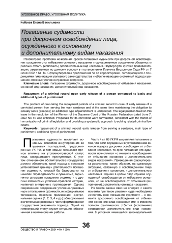 КОБЗЕВА Е. В. ПОГАШЕНИЕ СУДИМОСТИ ПРИ ДОСРОЧНОМ ОСВОБОЖДЕНИИ ЛИЦА, ОСУЖДЕННОГО К ОСНОВНОМУ И ДОПОЛНИТЕЛЬНОМУ ВИДАМ НАКАЗАНИЯ // ОБЩЕСТВО И ПРАВО. 2024. № 4 (90)