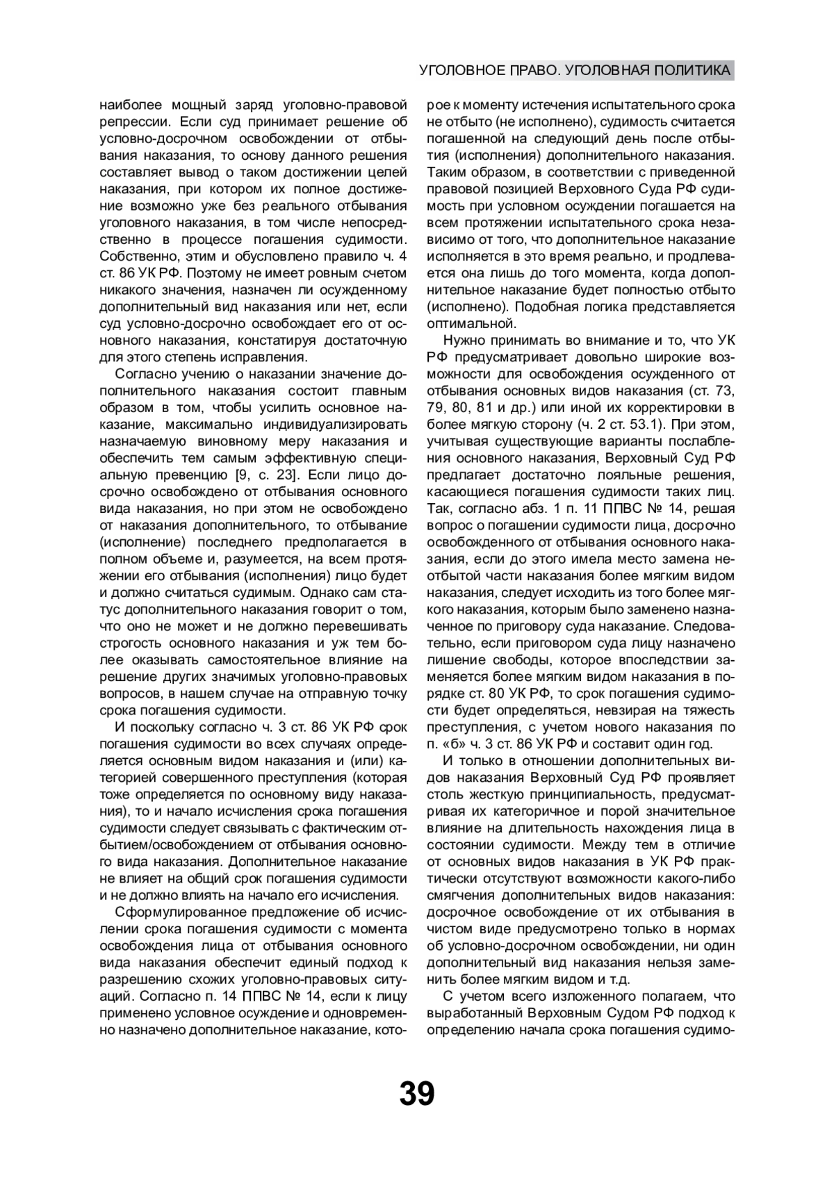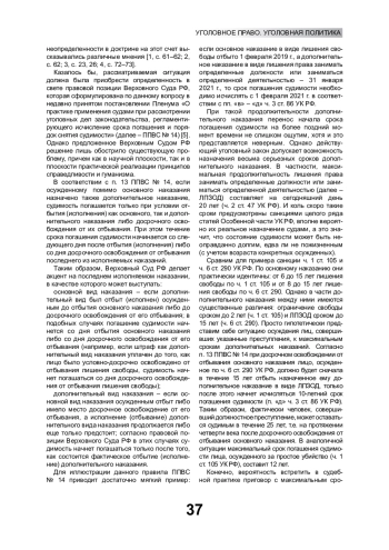 Рассмотрена проблема исчисления сроков погашения судимости при досрочном освобождении осужденного от отбывания основного наказания и одновременном сохранении обязанности реально отбыть (исполнить) дополнительный вид наказания. Подвергнута критике правовая позиция, закрепленная по данному вопросу в постановлении Пленума Верховного Суда РФ от 7 июня 2022 г. No 14. Сформулированы предложения по ее корректировке, согласующиеся с тенденциями гуманизации уголовного законодательства и обеспечивающие системный подход к решению смежных уголовно-правовых вопросов