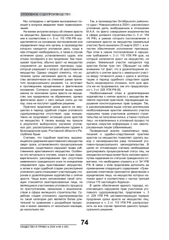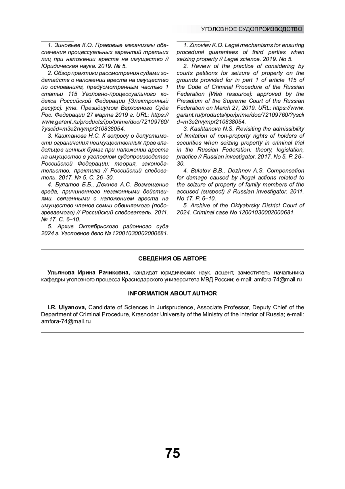 УЛЬЯНОВА И. Р. ОТДЕЛЬНЫЕ ВОПРОСЫ НАЛОЖЕНИЯ АРЕСТА НА ИМУЩЕСТВО В СВЕТЕ ЗАЩИТЫ ПРАВ УЧАСТНИКОВ УГОЛОВНОГО СУДОПРОИЗВОДСТВА // ОБЩЕСТВО И ПРАВО. 2024. № 4 (90)