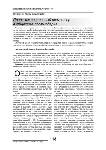 Статья: ПРАВО КАК СОЦИАЛЬНЫЙ РЕГУЛЯТОР В ОБЩЕСТВЕ ПОСТМОДЕРНА (2024)