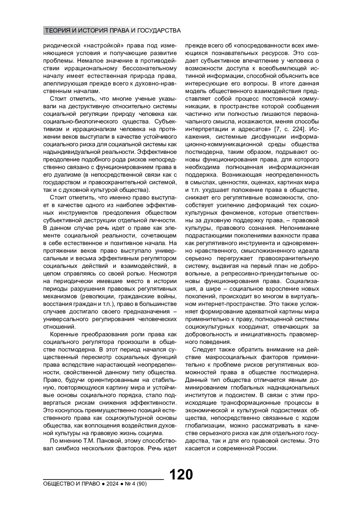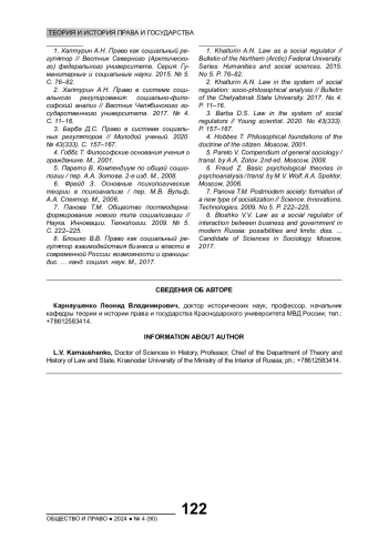 КАРНАУШЕНКО Л. В. ПРАВО КАК СОЦИАЛЬНЫЙ РЕГУЛЯТОР В ОБЩЕСТВЕ ПОСТМОДЕРНА // ОБЩЕСТВО И ПРАВО. 2024. № 4 (90)