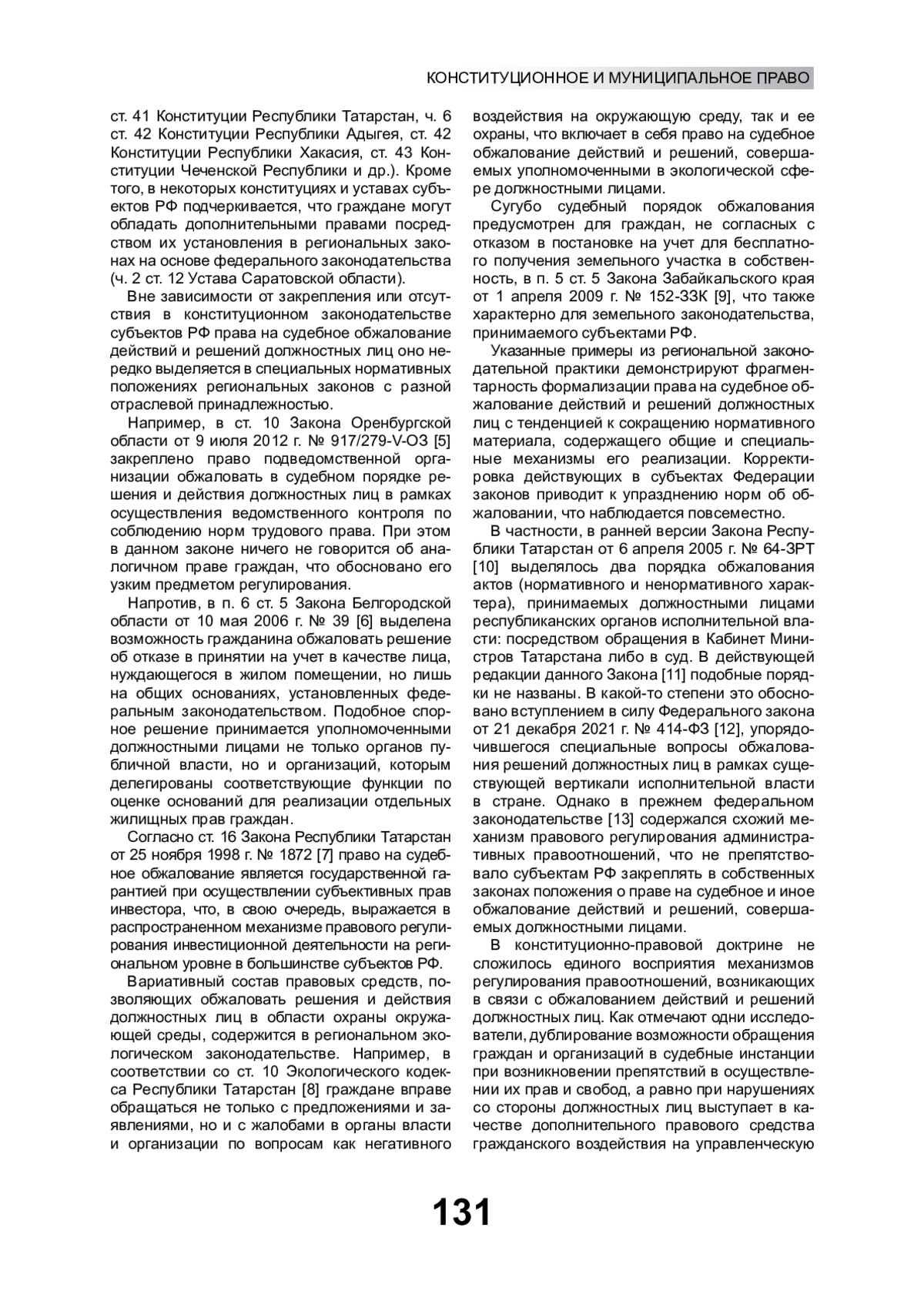 Субъективное право, предусмотренное ч. 2 ст. 46 Конституции РФ, представляет собой общеправовую гарантию реализации многих конституционных прав граждан и организаций при взаимодействии с институтами публичного управления. Несмотря на явный процессуально-правовой характер механизмов его реализации [1, с. 91; 2, с. 86], оно также подвержено влиянию материально-правовых норм [3, с. 35; 4, с. 17], часть из которых в силу федеративного устройства государства содержится в законодательстве субъектов РФ