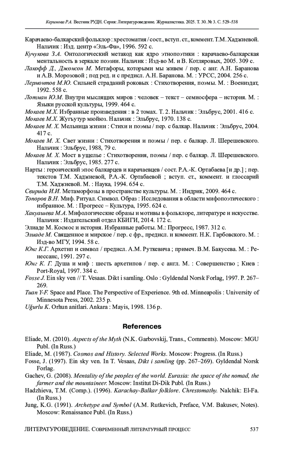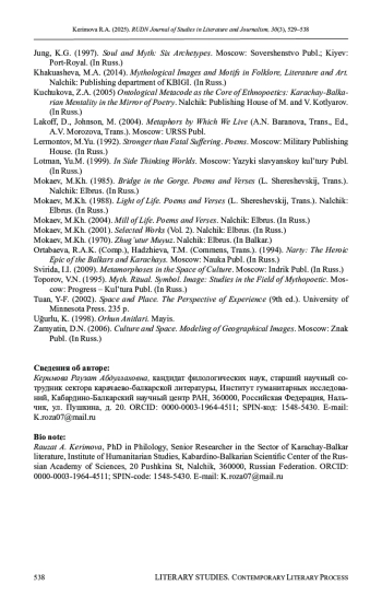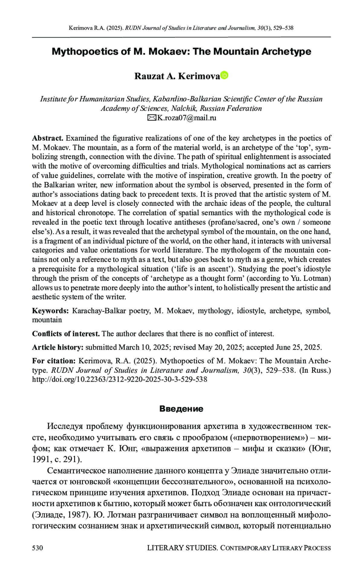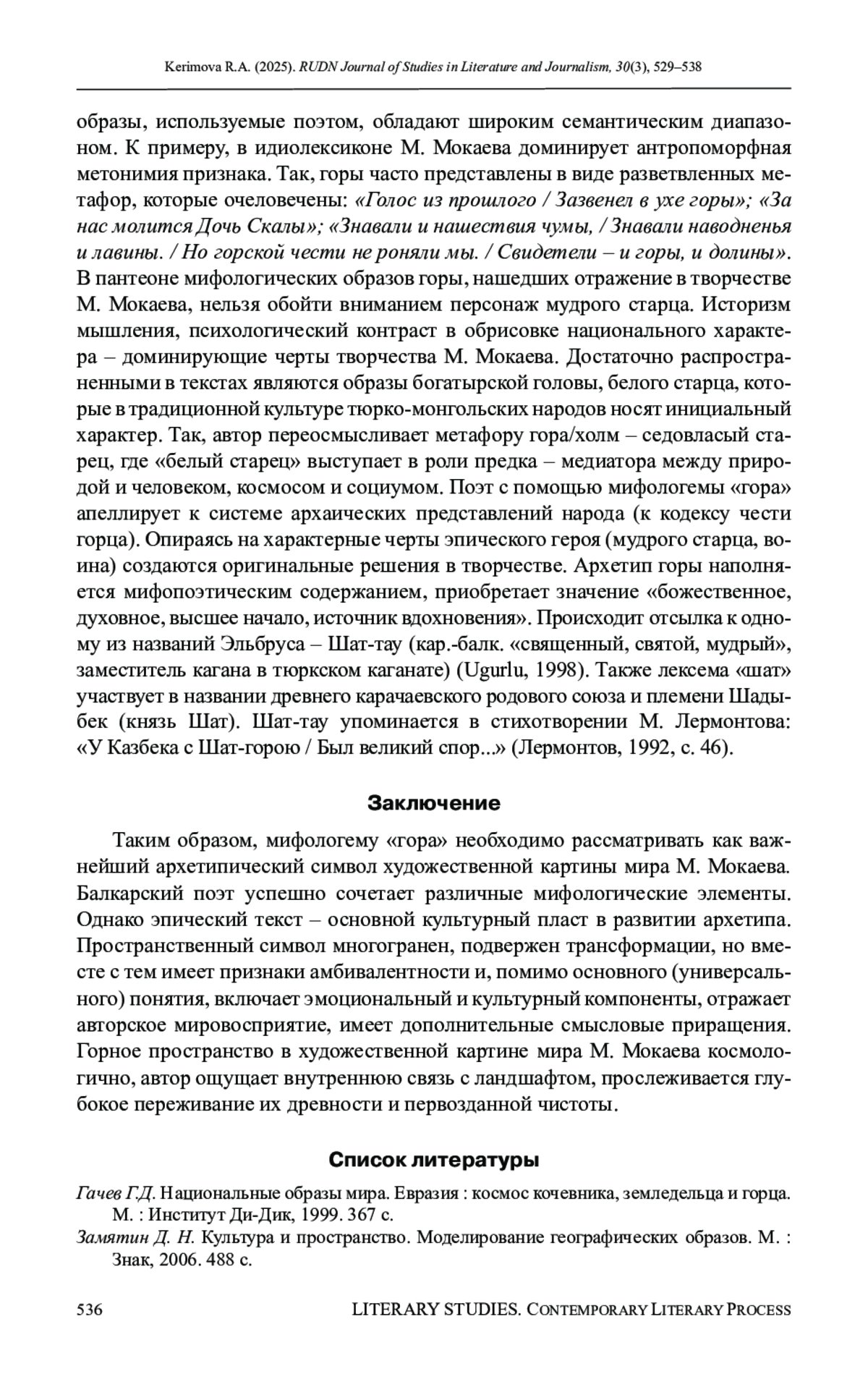КЕРИМОВА Р. А. МИФОПОЭТИКА М. МОКАЕВА: АРХЕТИП ГОРЫ // ВЕСТНИК РОССИЙСКОГО УНИВЕРСИТЕТА ДРУЖБЫ НАРОДОВ. СЕРИЯ: ЛИТЕРАТУРОВЕДЕНИЕ. ЖУРНАЛИСТИКА. 2025. ТОМ 30 № 3