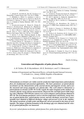 Тажен А. Б., Райымханов Ж. Р., Досболаев М. К., Рамазанов Т. С. Получение и диагностика импульсных плазменных потоков 463