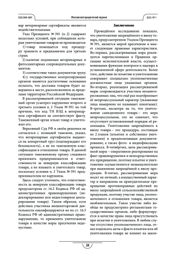 Результаты. Проведённый анализ показал, что уничтожение санкционных товаров является мерой пресечения правонарушения, предусмотренного статьёй 16.3 Кодекса об административных правонарушениях, имеет установленную процедуру и средства реализации.