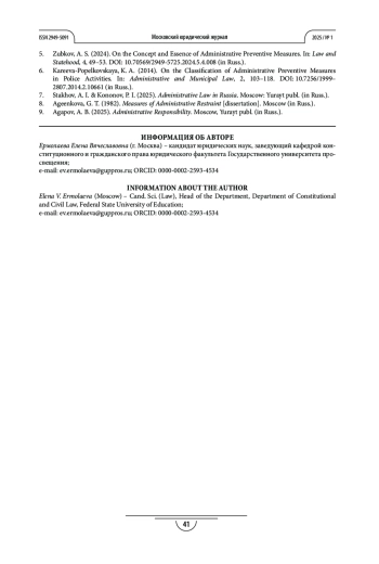 5. Зубков А. С. О понятии и сущности мер административного пресечения // Право и государственность. 2024. № 4. С. 49-53. https://doi.org/10.70569/2949-5725.2024.5.4.008