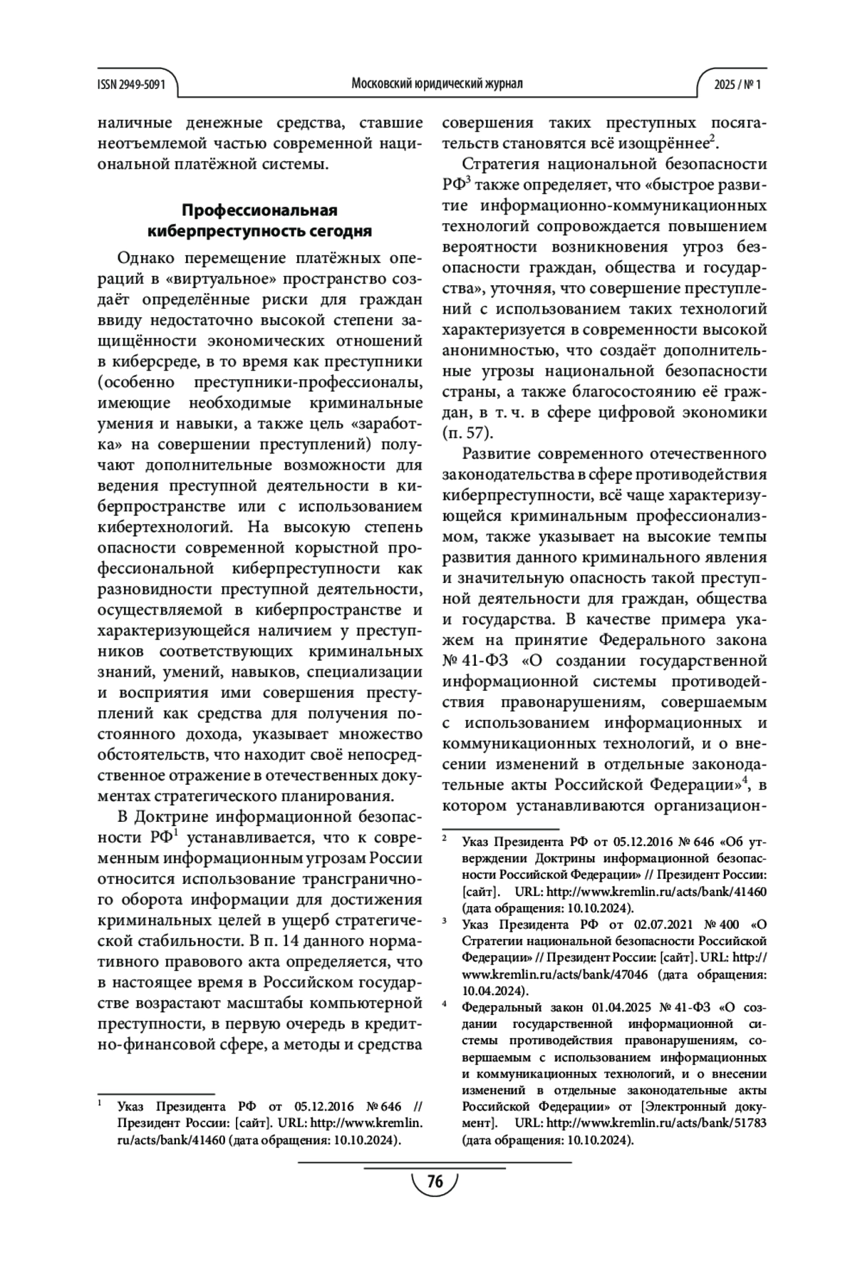 2. Астахова Е. А. Перспективы противодействия использованию информационно-коммуникационных технологий в преступных целях // Правовая политика и правовая жизнь. 2025. № 1. С. 56-64.