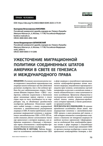 РЕЗУЛЬТАТЫ ИССЛЕДОВАНИЯ. По итогам проведенного исследования сделан вывод, что миграционная политика и законодательство США прошли в своем развитии ряд этапов, в ходе которых отношение к иммигрантам изменялось в диапазоне от поощрения миграции до введения жестких ограничений. Сформированные на сегодняшний день международно-правовые основы в сфере миграции и вынужденного перемещения не в полной мере связывают США по причине участия государства в малом числе применимых международных договоров, а действующие для США обязательства не в полной мере выполняются.