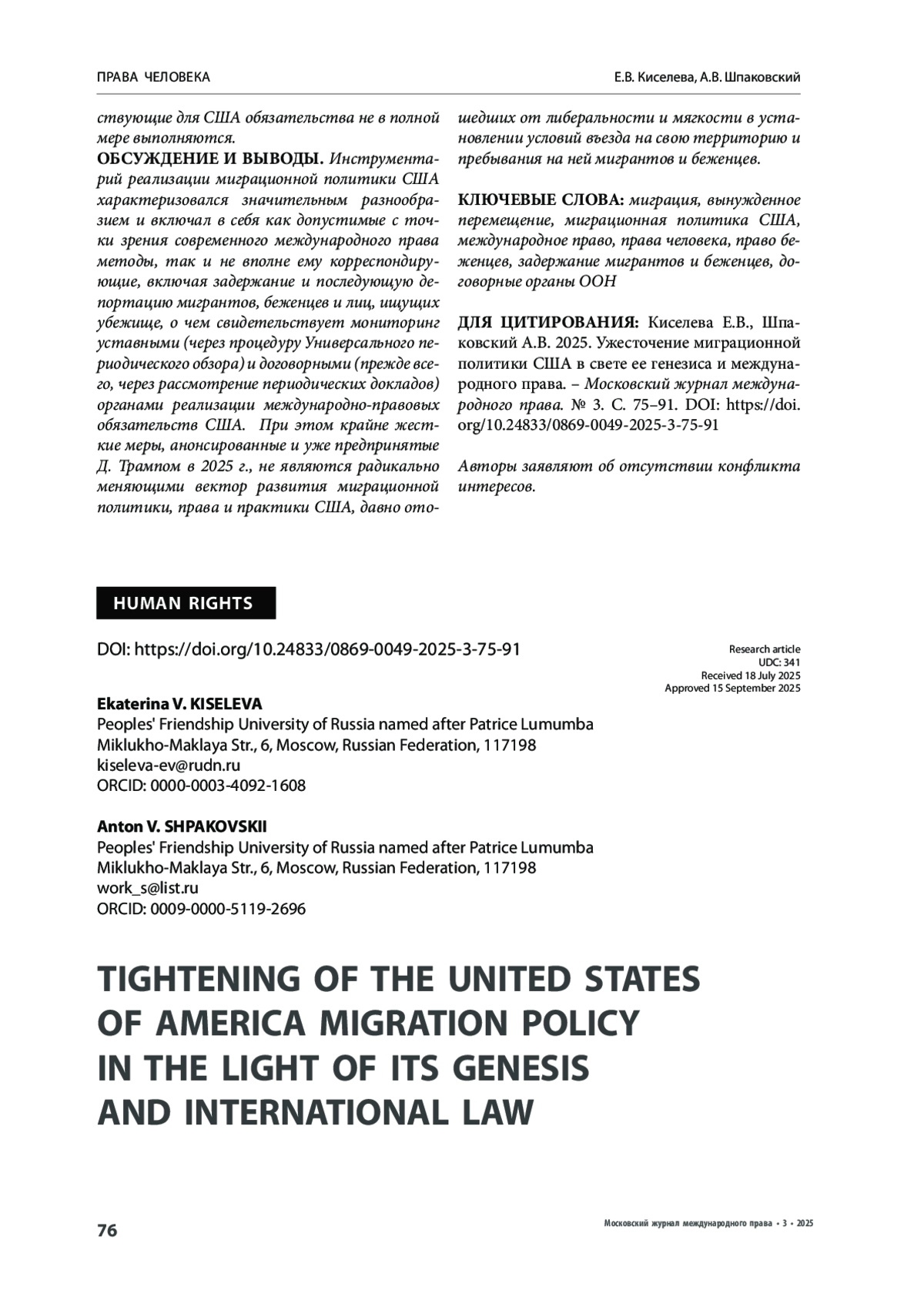 ОБСУЖДЕНИЕ И ВЫВОДЫ. Инструментарий реализации миграционной политики США характеризовался значительным разнообразием и включал в себя как допустимые с точки зрения современного международного права методы, так и не вполне ему корреспондирующие, включая задержание и последующую депортацию мигрантов, беженцев и лиц, ищущих убежище, о чем свидетельствует мониторинг уставными (через процедуру Универсального периодического обзора) и договорными (прежде всего, через рассмотрение периодических докладов) органами реализации международно-правовых обязательств США. При этом крайне жесткие меры, анонсированные и уже предпринятые Д. Трампом в 2025 г., не являются радикально меняющими вектор развития миграционной политики, права и практики США, давно отошедших от либеральности и мягкости в установлении условий въезда на свою территорию и пребывания на ней мигрантов и беженцев.