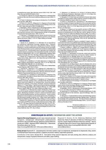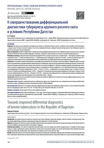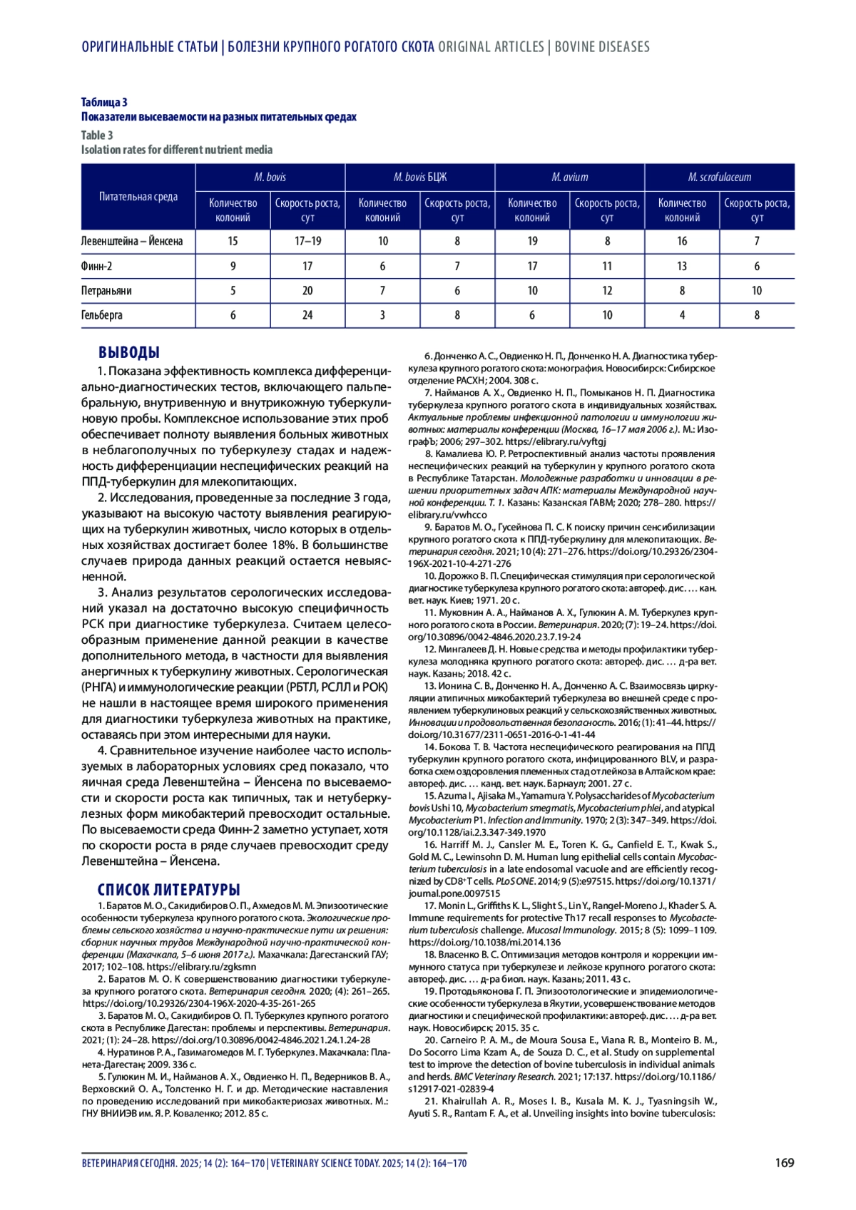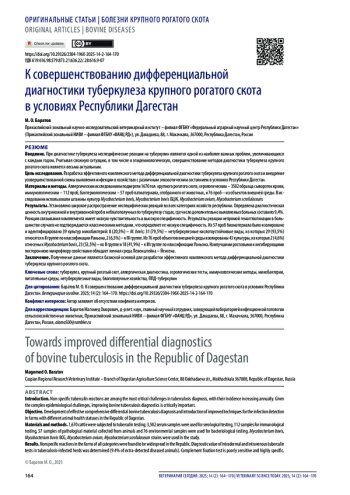 3. Баратов М. О., Сакидибиров О. П. Туберкулез крупного рогатого скота в Республике Дагестан: проблемы и перспективы. Ветеринария. 2021; (1): 24-28. DOI: 10.30896/0042-4846.2021.24.1.24-28