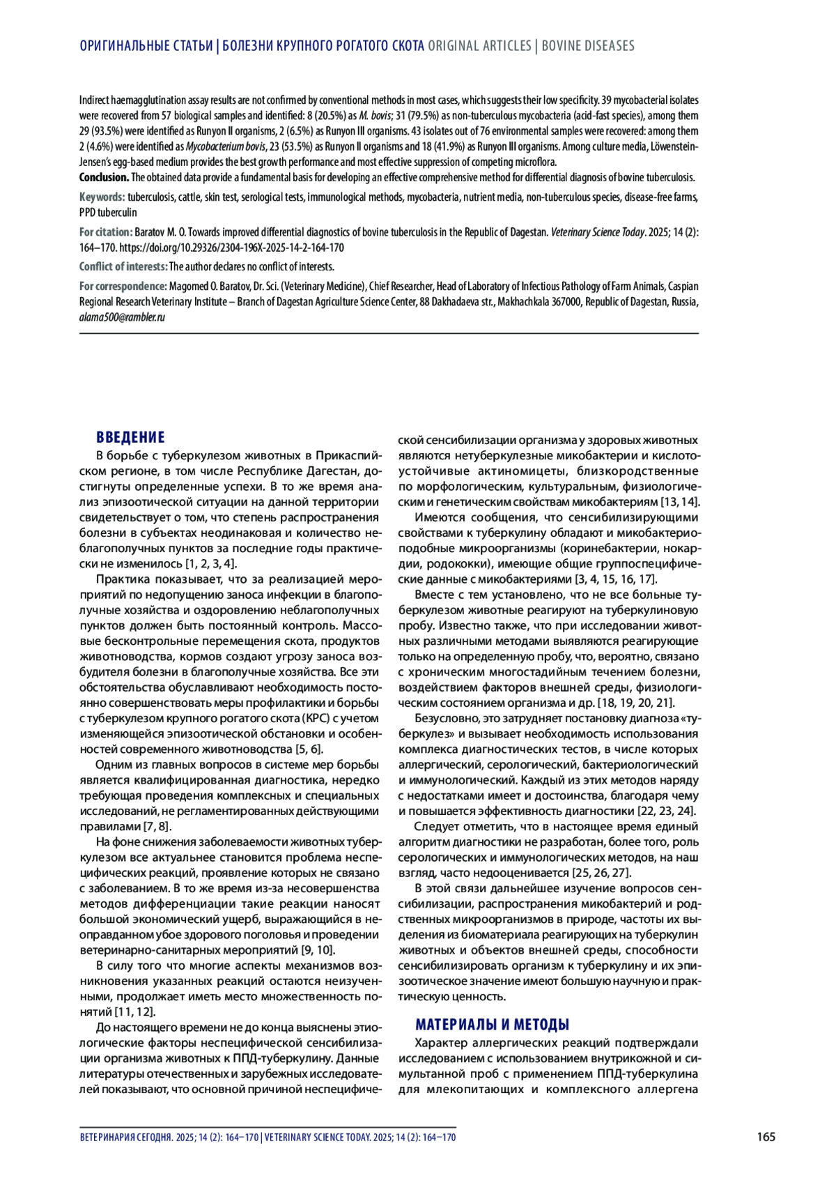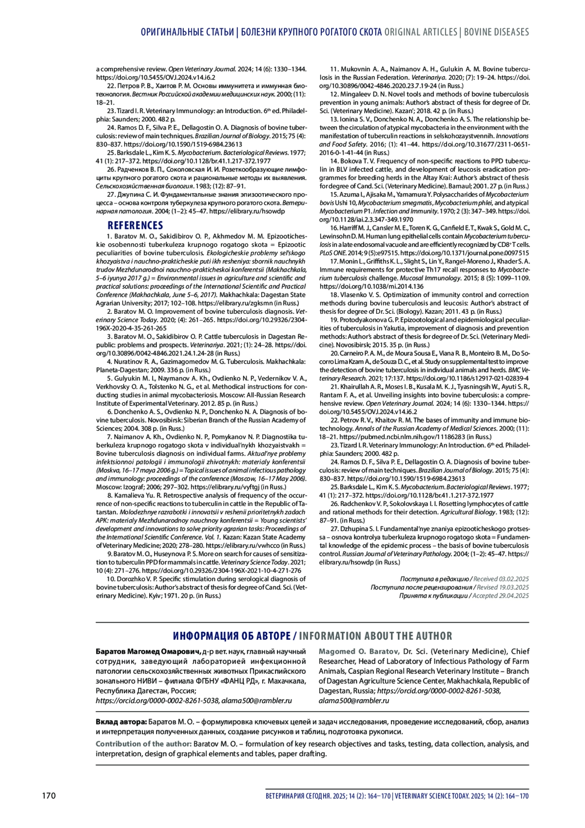 2. Баратов М. О. К совершенствованию диагностики туберкулеза крупного рогатого скота. Ветеринария сегодня. 2020; (4): 261-265. DOI: 10.29326/2304-196X-2020-4-35-261-265