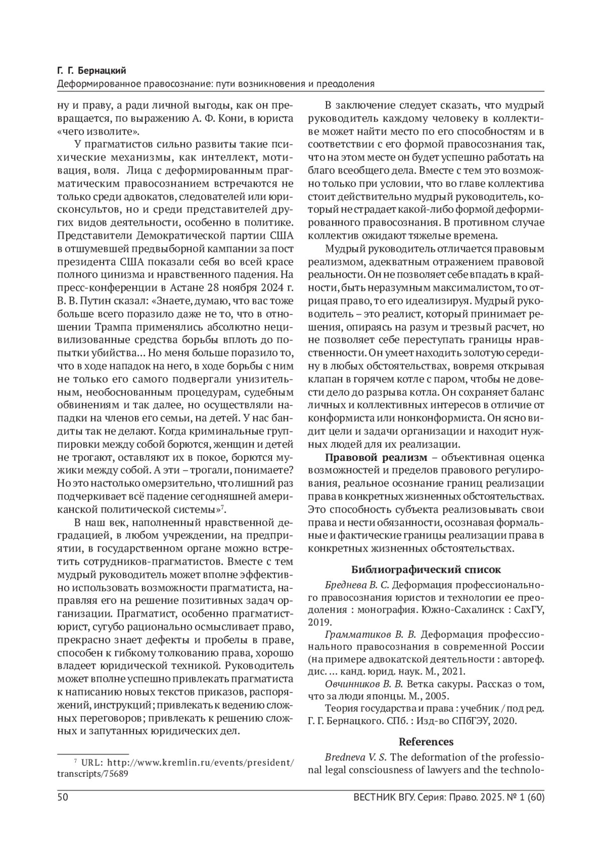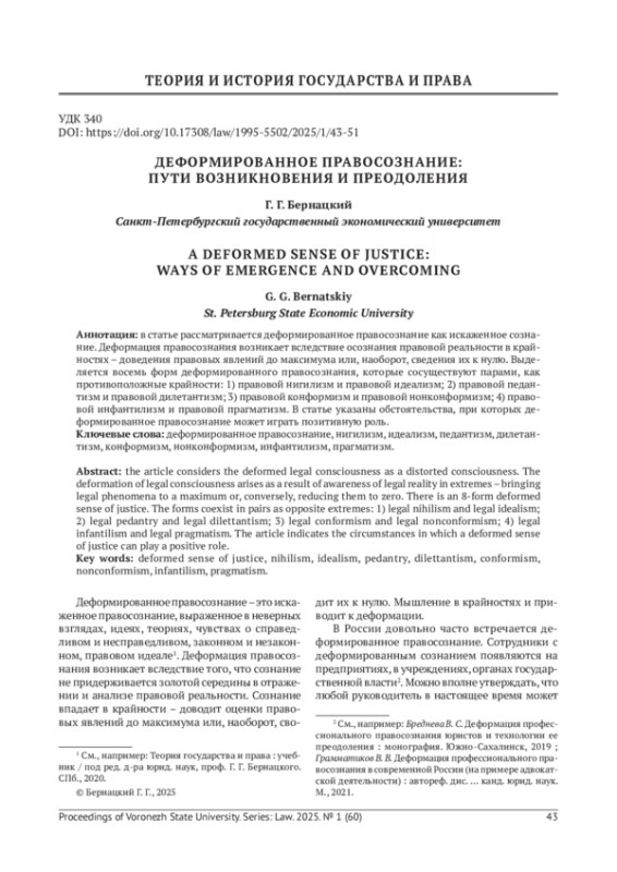 В статье рассматривается деформированное правосознание как искаженное сознание. Деформация правосознания возникает вследствие осознания правовой реальности в крайностях - доведения правовых явлений до максимума или, наоборот, сведения их к нулю. Выделяется восемь форм деформированного правосознания, которые сосуществуют парами, как противоположные крайности: 1) правовой нигилизм и правовой идеализм; 2) правовой педантизм и правовой дилетантизм; 3) правовой конформизм и правовой нонконформизм; 4) правовой инфантилизм и правовой прагматизм. В статье указаны обстоятельства, при которых деформированное правосознание может играть позитивную роль.