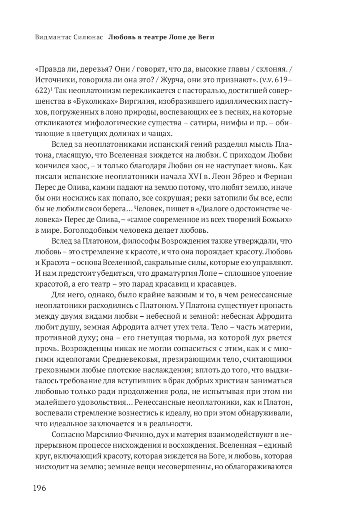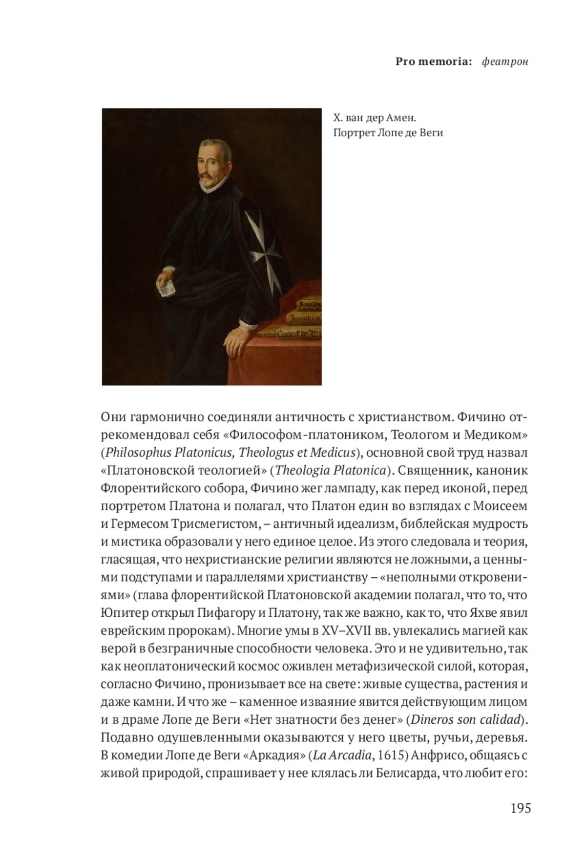 Они гармонично соединяли античность с христианством. Фичино отрекомендовал себя «Философом-платоником, Теологом и Медиком» (Philosophus Platonicus, Theologus et Medicus), основной свой труд назвал «Платоновской теологией» (Theologia Platonica). Священник, каноник Флорентийского собора, Фичино жег лампаду, как перед иконой, перед портретом Платона и полагал, что Платон един во взглядах с Моисеем и Гермесом Трисмегистом, – античный идеализм, библейская мудрость и мистика образовали у него единое целое. Из этого следовала и теория, гласящая, что нехристианские религии являются не ложными, а ценными подступами и параллелями христианству – «неполными откровениями» (глава флорентийской Платоновской академии полагал, что то, что Юпитер открыл Пифагору и Платону, так же важно, как то, что Яхве явил еврейским пророкам). Многие умы в XV–XVII вв. увлекались магией как верой в безграничные способности человека. Это и не удивительно, так как неоплатонический космос оживлен метафизической силой, которая, согласно Фичино, пронизывает все на свете: живые существа, растения и даже камни. И что же – каменное изваяние явится действующим лицом и в драме Лопе де Веги «Нет знатности без денег» (Dineros son calidad). Подавно одушевленными оказываются у него цветы, ручьи, деревья. В комедии Лопе де Веги «Аркадия» (La Arcadia, 1615) Анфрисо, общаясь с живой природой, спрашивает у нее клялась ли Белисарда, что любит его: