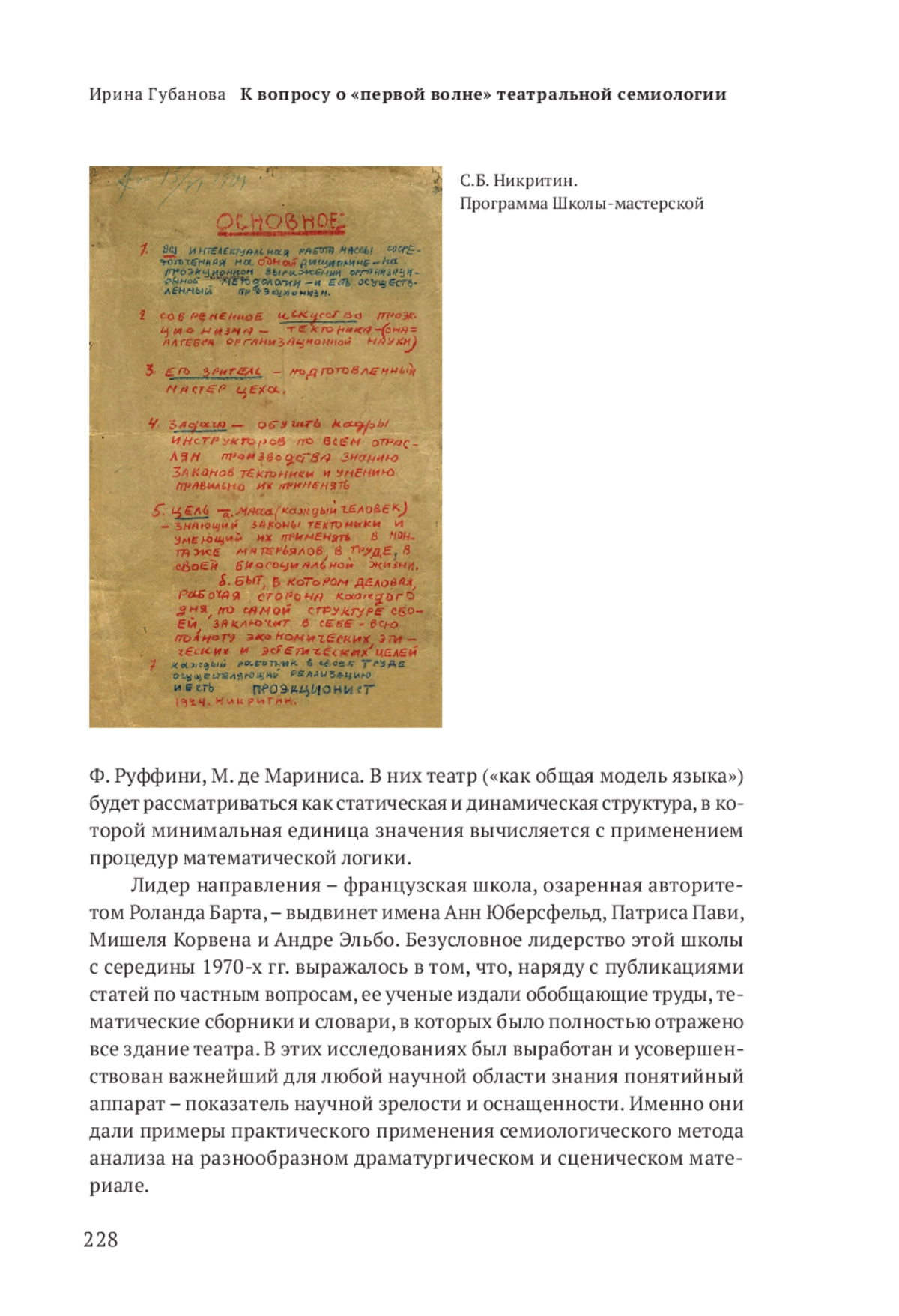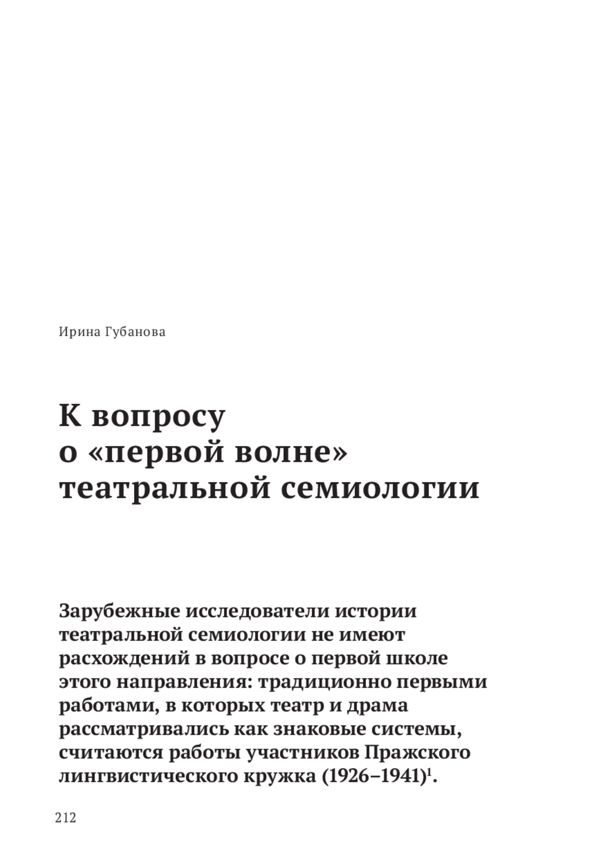 Зарубежные исследователи истории театральной семиологии не имеют расхождений в вопросе о первой школе этого направления: традиционно первыми работами, в которых театр и драма рассматривались как знаковые системы, считаются работы участников Пражского лингвистического кружка (1926–1941)1.