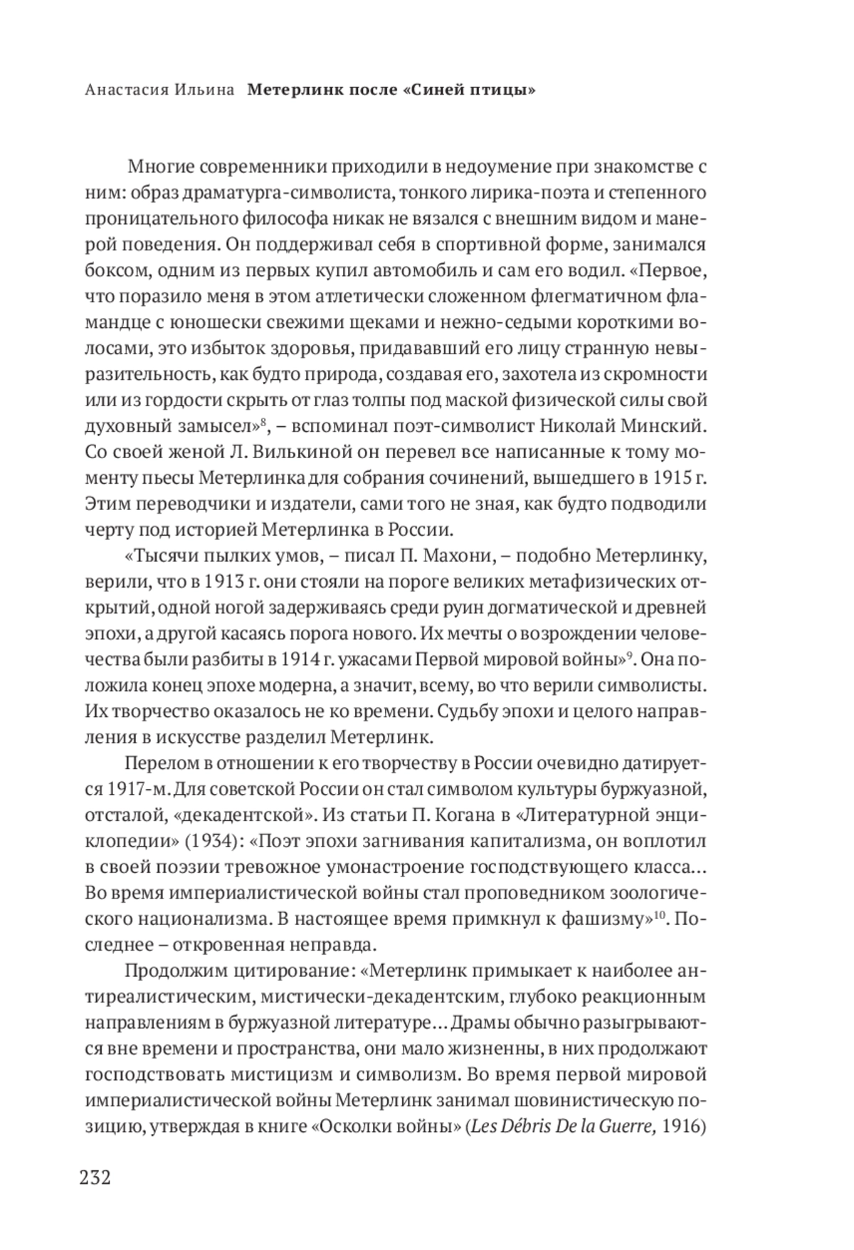 Мало того, Станиславский предпринял поездку к Метерлинку в Нормандию для личного знакомства, об этой встрече он оставил любопытные воспоминания 3. После московской премьеры пьесой заинтересовался театральный мир по обе стороны океана. По словам Патрика Махони, «Синяя птица» стала «хитом в одночасье»4. «Спектакль для всех поколений»5 не сходил со сцены МХТ 6 вплоть до недавнего времени. Но после 1917 г. Метерлинк будто бы умер, хотя фактически пережил Вторую мировую войну. Революция и гражданская война в России привели к становлению нового Советского государства – и связь с драматургом оброрвалась. Две пьесы, написанные в 1917 г., были изданы только в 1962-м. Остальные не переведены и не изданы. Постараемся восполнить этот исторический пробел.