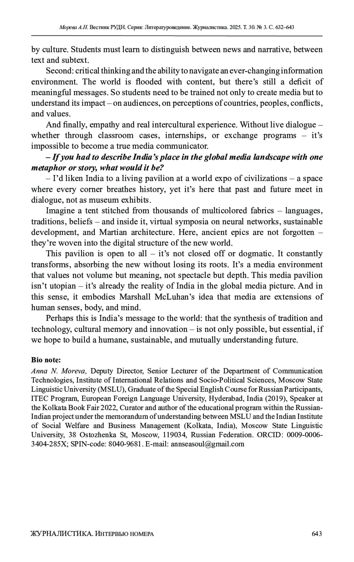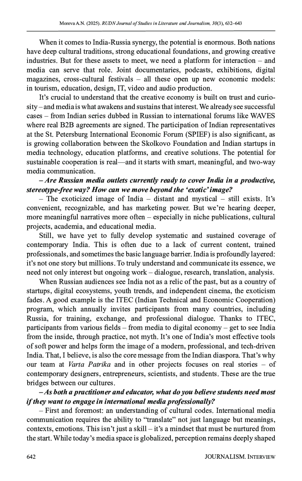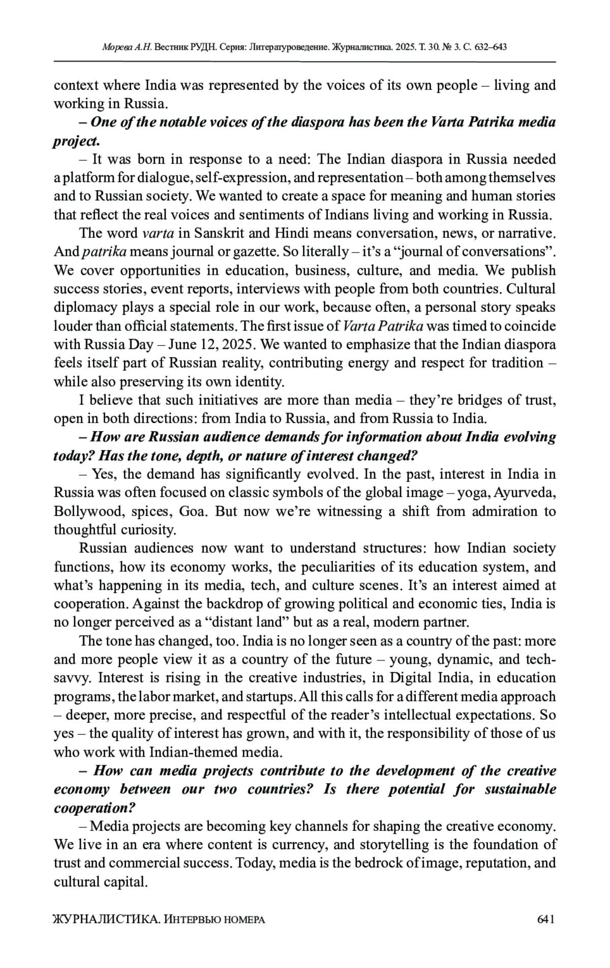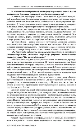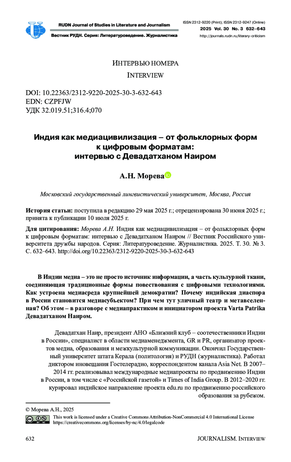 МОРЕВА А. Н. ИНДИЯ КАК МЕДИАЦИВИЛИЗАЦИЯ - ОТ ФОЛЬКЛОРНЫХ ФОРМ К ЦИФРОВЫМ ФОРМАТАМ: ИНТЕРВЬЮ С ДЕВАДАТХАНОМ НАИРОМ // ВЕСТНИК РОССИЙСКОГО УНИВЕРСИТЕТА ДРУЖБЫ НАРОДОВ. СЕРИЯ: ЛИТЕРАТУРОВЕДЕНИЕ. ЖУРНАЛИСТИКА. 2025. ТОМ 30 № 3