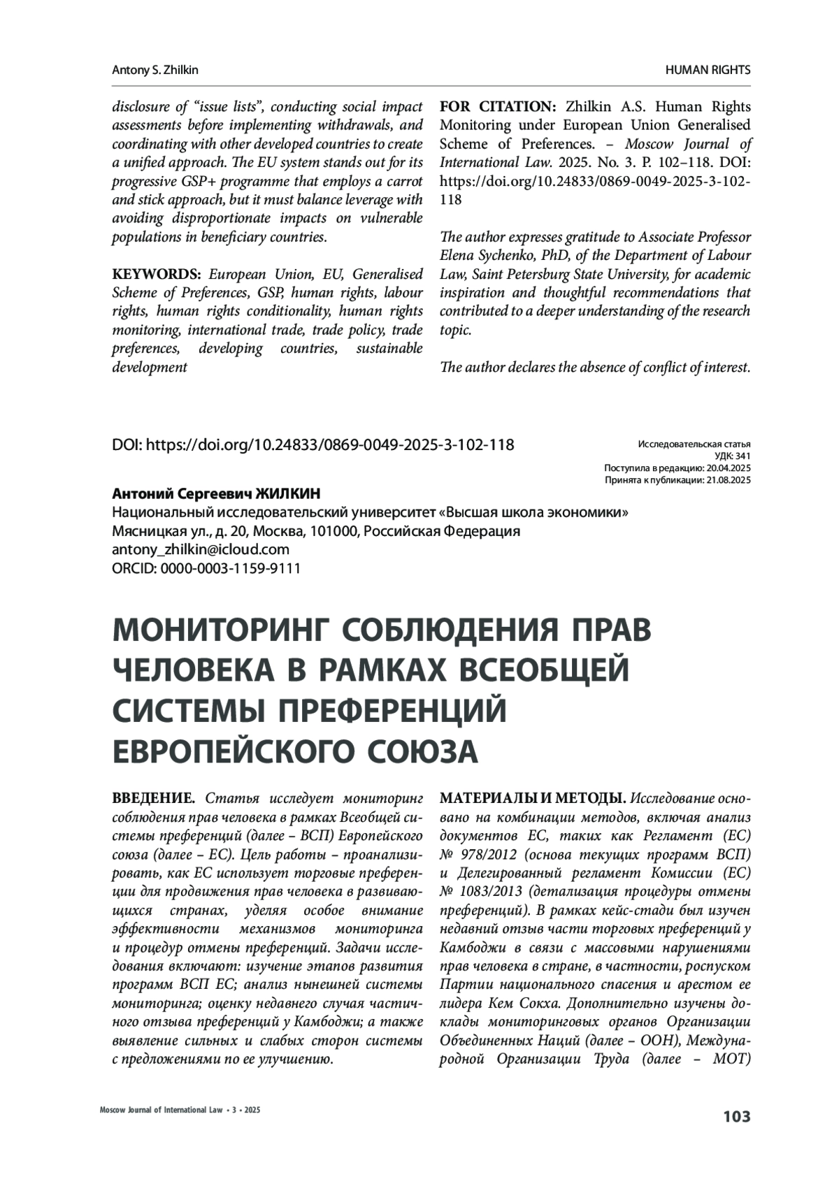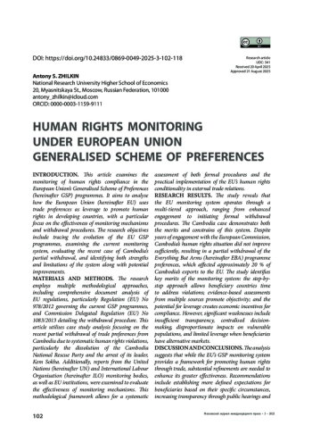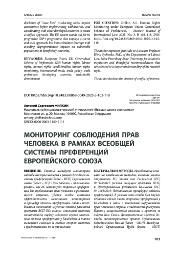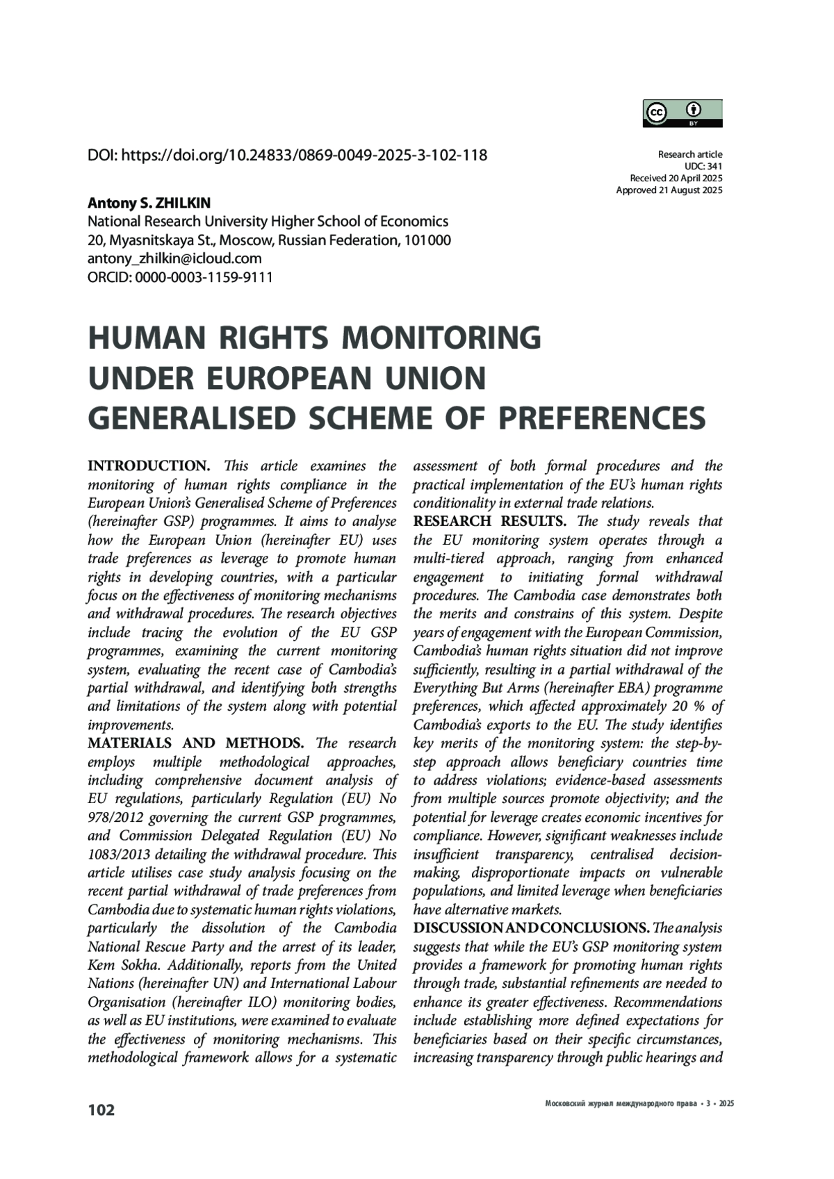 ВВЕДЕНИЕ. Статья исследует мониторинг соблюдения прав человека в рамках Всеобщей системы преференций (далее – ВСП) Европейского союза (далее – ЕС). Цель работы – проанализировать, как ЕС использует торговые преференции для продвижения прав человека в развивающихся странах, уделяя особое внимание эффективности механизмов мониторинга и процедур отмены преференций. Задачи исследования включают: изучение этапов развития программ ВСП ЕС; анализ нынешней системы мониторинга; оценку недавнего случая частичного отзыва преференций у Камбоджи; а также выявление сильных и слабых сторон системы с предложениями по ее улучшению.