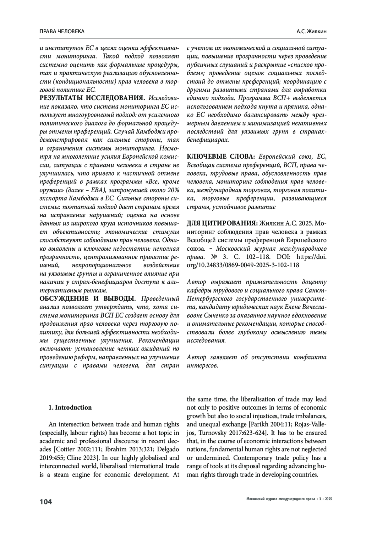 МАТЕРИАЛЫ И МЕТОДЫ. Исследование основано на комбинации методов, включая анализ документов ЕС, таких как Регламент (ЕС) № 978/2012 (основа текущих программ ВСП) и Делегированный регламент Комиссии (ЕС) № 1083/2013 (детализация процедуры отмены преференций). В рамках кейс-стади был изучен недавний отзыв части торговых преференций у Камбоджи в связи с массовыми нарушениями прав человека в стране, в частности, роспуском Партии национального спасения и арестом ее лидера Кем Сокха. Дополнительно изучены доклады мониторинговых органов Организации Объединенных Наций (далее – ООН), Международной Организации Труда (далее – МОТ) и институтов ЕС в целях оценки эффективности мониторинга. Такой подход позволяет системно оценить как формальные процедуры, так и практическую реализацию обусловленности (кондициональности) прав человека в торговой политике ЕС.