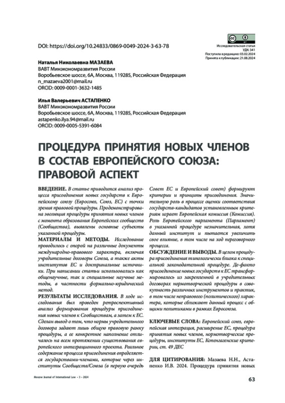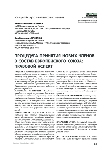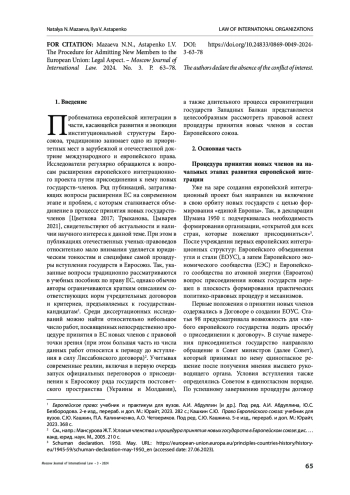 ВВЕДЕНИЕ. В статье приводится анализ процесса присоединения новых государств к Европейскому союзу (Евросоюз, Союз, ЕС) с точки зрения правовой процедуры. Продемонстрирована эволюция процедуры принятия новых членов с момента образования Европейских сообществ (Сообщества), выявлены основные субъекты указанной процедуры.