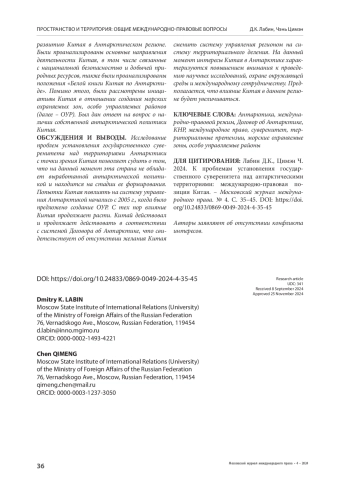 ВВЕДЕНИЕ. Антарктический регион является уникальным с точки зрения организации эффективного управления одновременно большим числом государств. Для этой цели в 1959 г. был заключен Договор об Антарктике, который позволил предотвратить возникновение конфликтов. Тем не менее не так давно стала активна обсуждаться концепция территориального деления данного региона. Китай, являясь одной из наиболее быстроразвивающихся с экономической точки зрения государств, что влечет за собой заинтересованность в усилении влияния в Антарктическом регионе, также активно участвует в разрешении вопросов, связанных с правовым регулированием Антарктики. Цель статьи – определить позицию Китая в отношении деятельности в Антарктическом регионе в целом, а также, с точки зрения установления государственного суверенитета над территориями Антарктики.