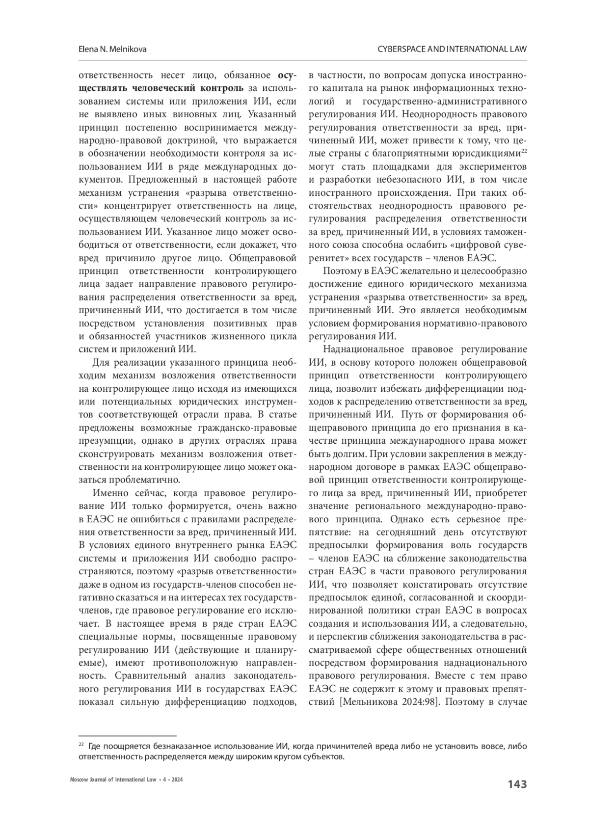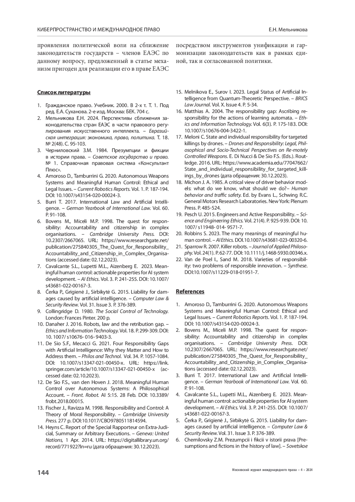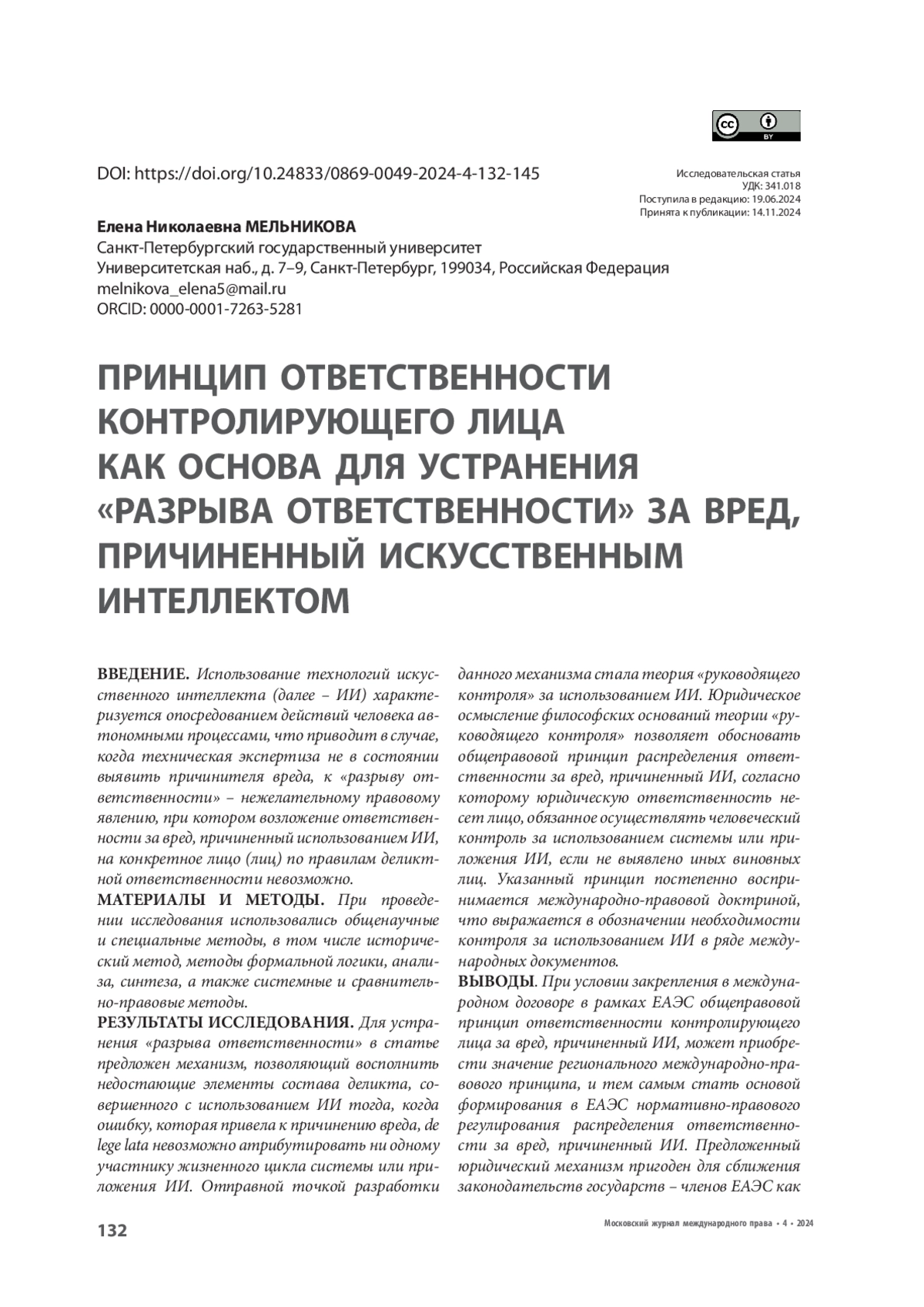 МЕЛЬНИКОВА Е. Н. ПРИНЦИП ОТВЕТСТВЕННОСТИ КОНТРОЛИРУЮЩЕГО ЛИЦА КАК ОСНОВА ДЛЯ УСТРАНЕНИЯ «РАЗРЫВА ОТВЕТСТВЕННОСТИ» ЗА ВРЕД, ПРИЧИНЕННЫЙ ИСКУССТВЕННЫМ ИНТЕЛЛЕКТОМ // МОСКОВСКИЙ ЖУРНАЛ МЕЖДУНАРОДНОГО ПРАВА. 2024. ВЫПУСК 4