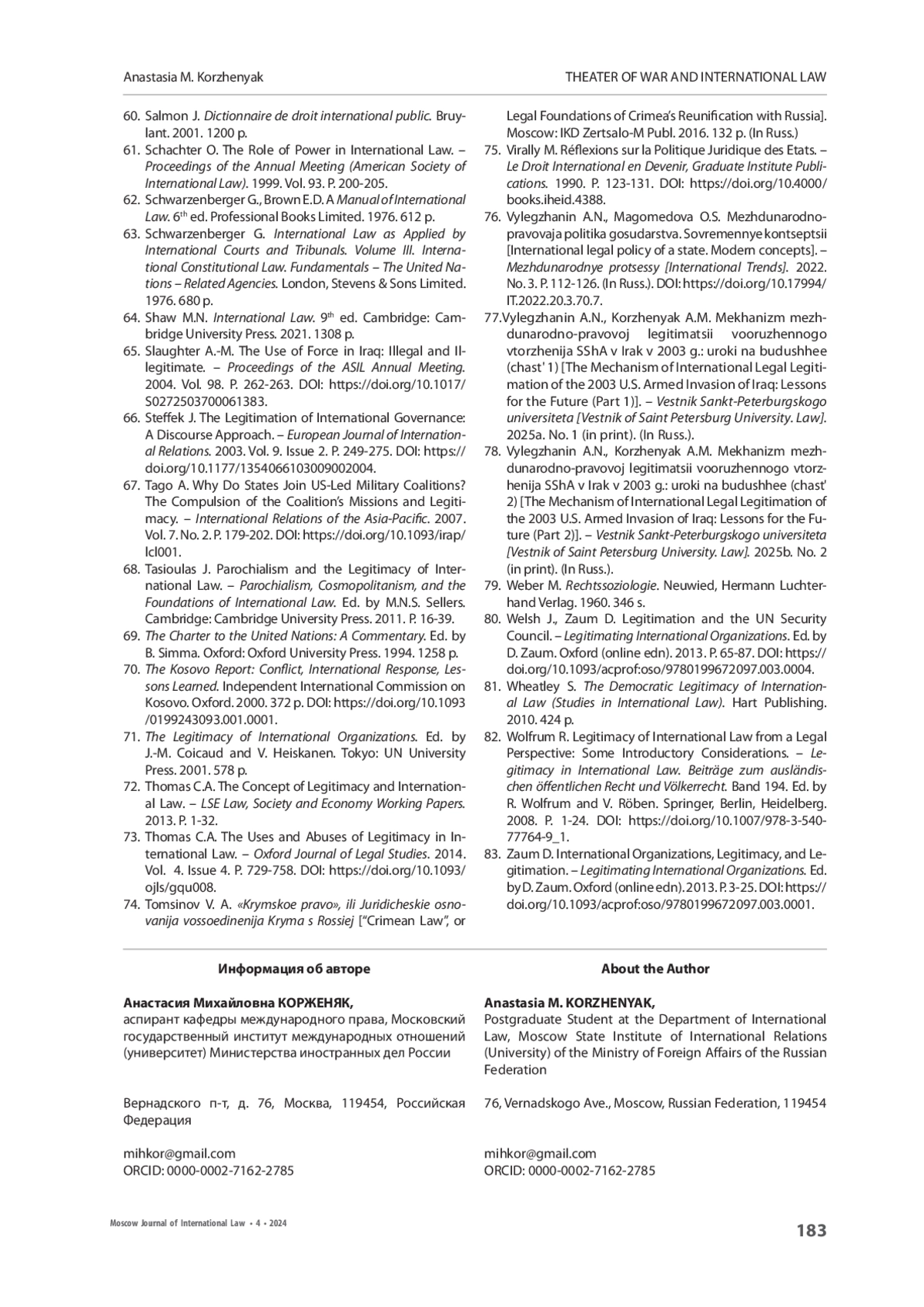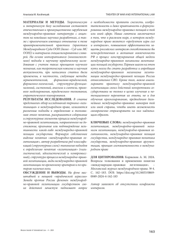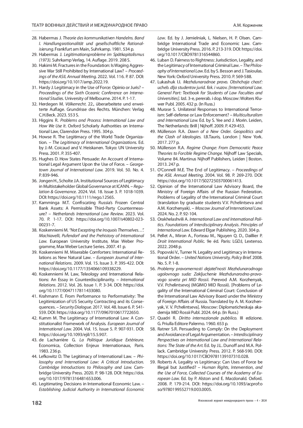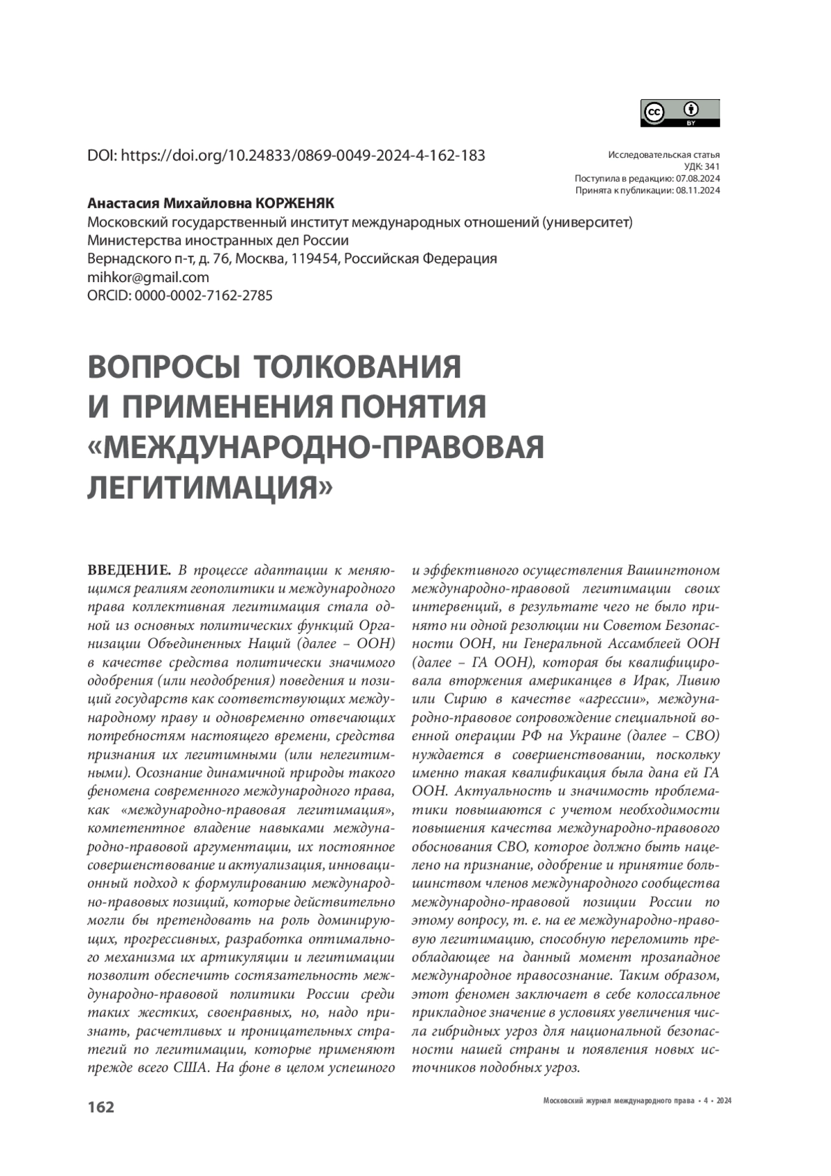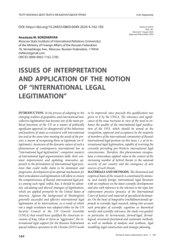 КОРЖЕНЯК А. М. ВОПРОСЫ ТОЛКОВАНИЯ И ПРИМЕНЕНИЯ ПОНЯТИЯ «МЕЖДУНАРОДНО-ПРАВОВАЯ ЛЕГИТИМАЦИЯ» // МОСКОВСКИЙ ЖУРНАЛ МЕЖДУНАРОДНОГО ПРАВА. 2024. ВЫПУСК 4
