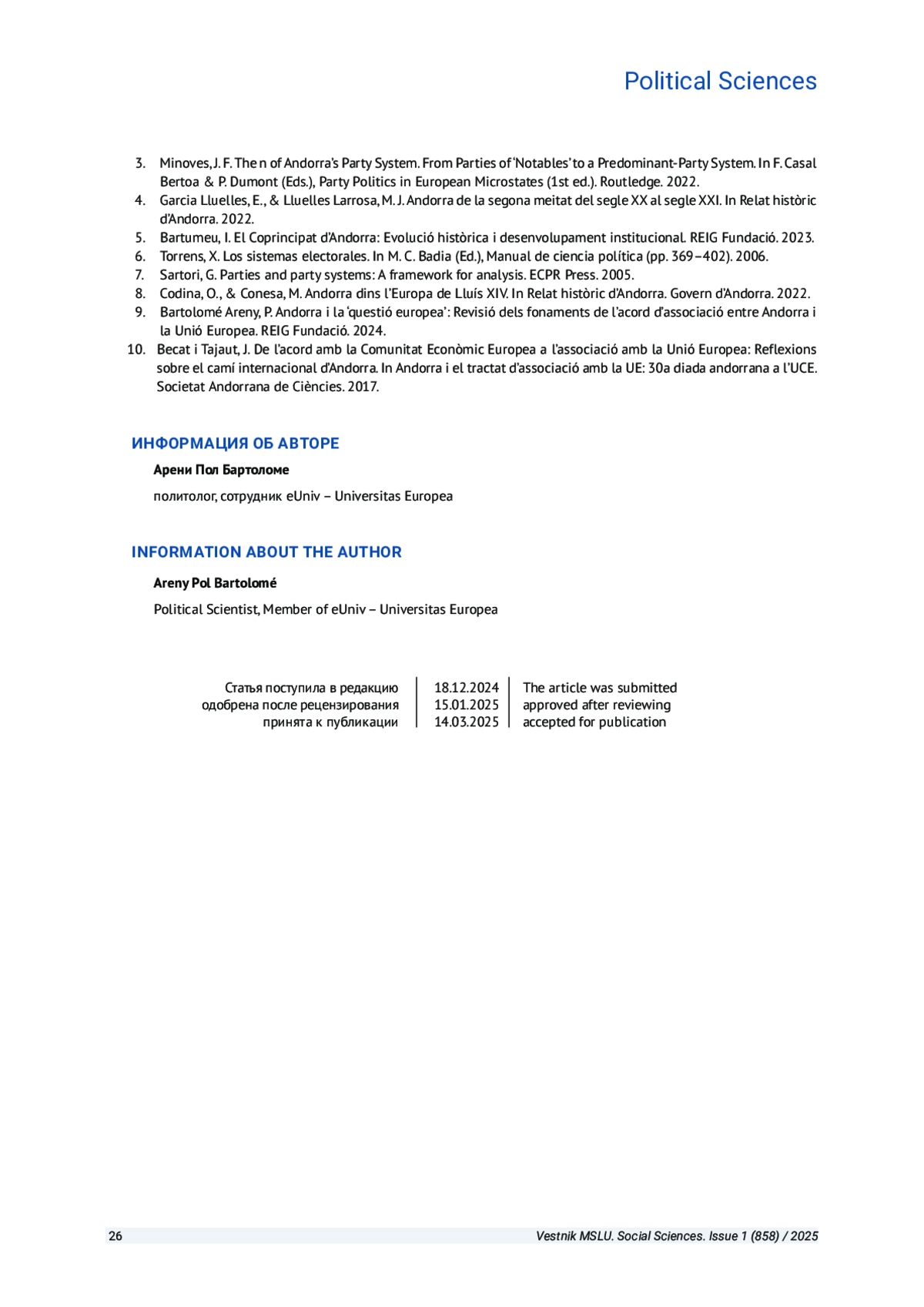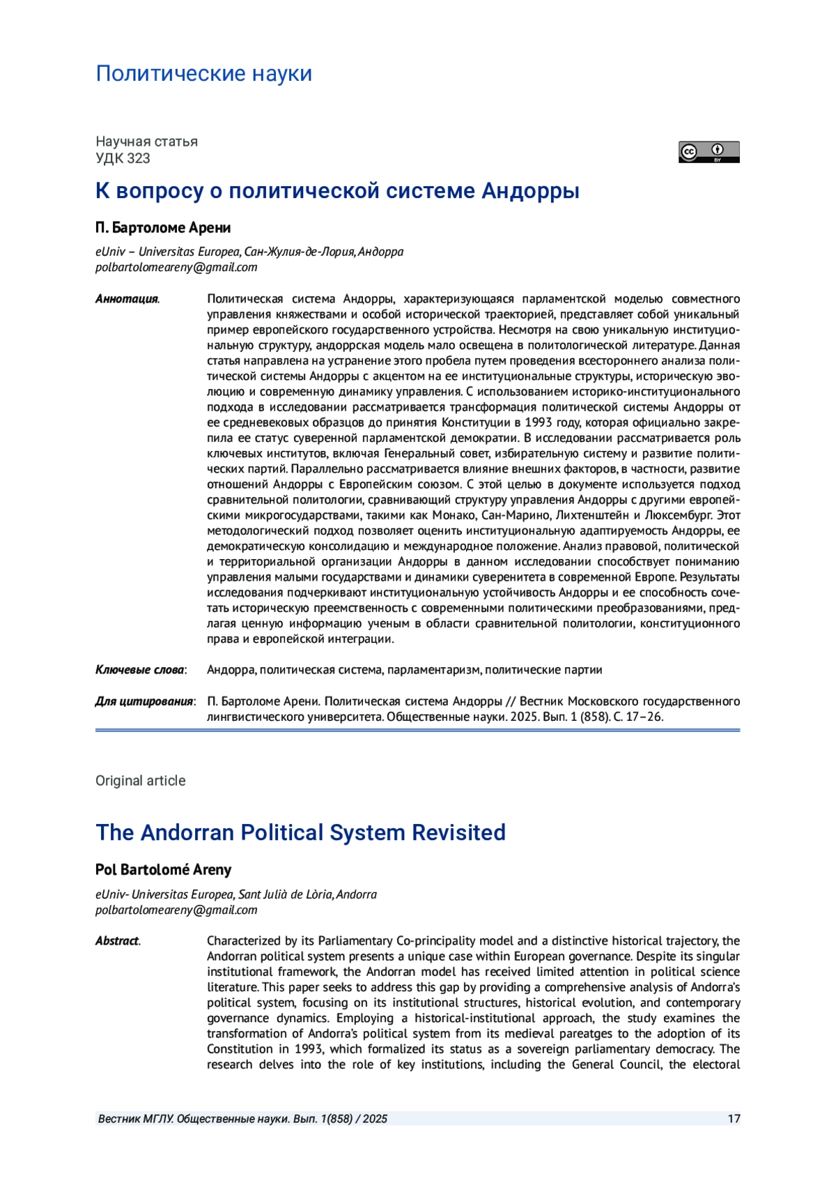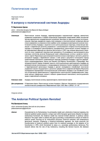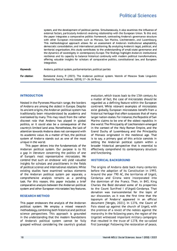 Политическая система Андорры, характеризующаяся парламентской моделью совместного управления княжествами и особой исторической траекторией, представляет собой уникальный пример европейского государственного устройства. Несмотря на свою уникальную институциональную структуру, андоррская модель мало освещена в политологической литературе. Данная статья направлена на устранение этого пробела путем проведения всестороннего анализа политической системы Андорры с акцентом на ее институциональные структуры, историческую эволюцию и современную динамику управления. С использованием историко-институционального подхода в исследовании рассматривается трансформация политической системы Андорры от ее средневековых образцов до принятия Конституции в 1993 году, которая официально закрепила ее статус суверенной парламентской демократии. В исследовании рассматривается роль ключевых институтов, включая Генеральный совет, избирательную систему и развитие политических партий. Параллельно рассматривается влияние внешних факторов, в частности, развитие отношений Андорры с Европейским союзом. С этой целью в документе используется подход сравнительной политологии, сравнивающий структуру управления Андорры с другими европейскими микрогосударствами, такими как Монако, Сан-Марино, Лихтенштейн и Люксембург. Этот методологический подход позволяет оценить институциональную адаптируемость Андорры, ее демократическую консолидацию и международное положение. Анализ правовой, политической и территориальной организации Андорры в данном исследовании способствует пониманию управления малыми государствами и динамики суверенитета в современной Европе. Результаты исследования подчеркивают институциональную устойчивость Андорры и ее способность сочетать историческую преемственность с современными политическими преобразованиями, предлагая ценную информацию ученым в области сравнительной политологии, конституционного права и европейской интеграции.