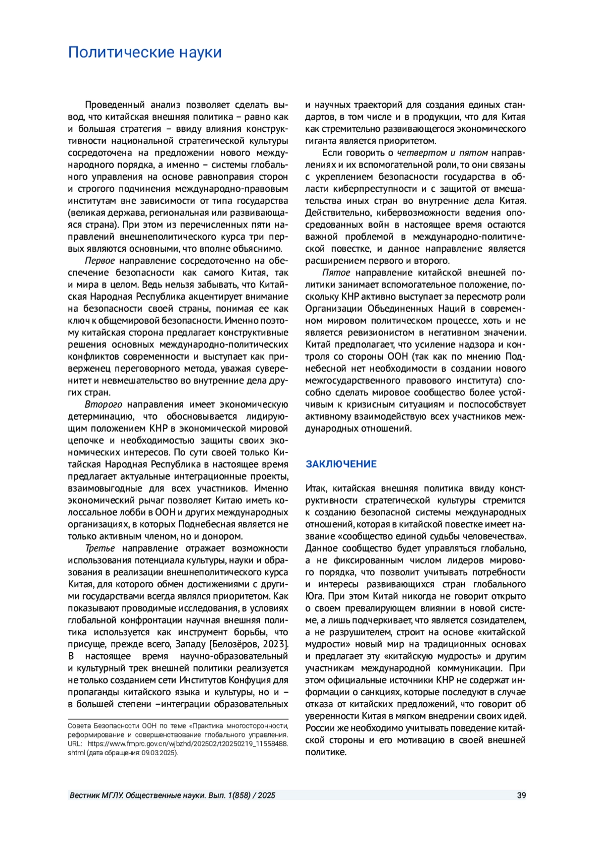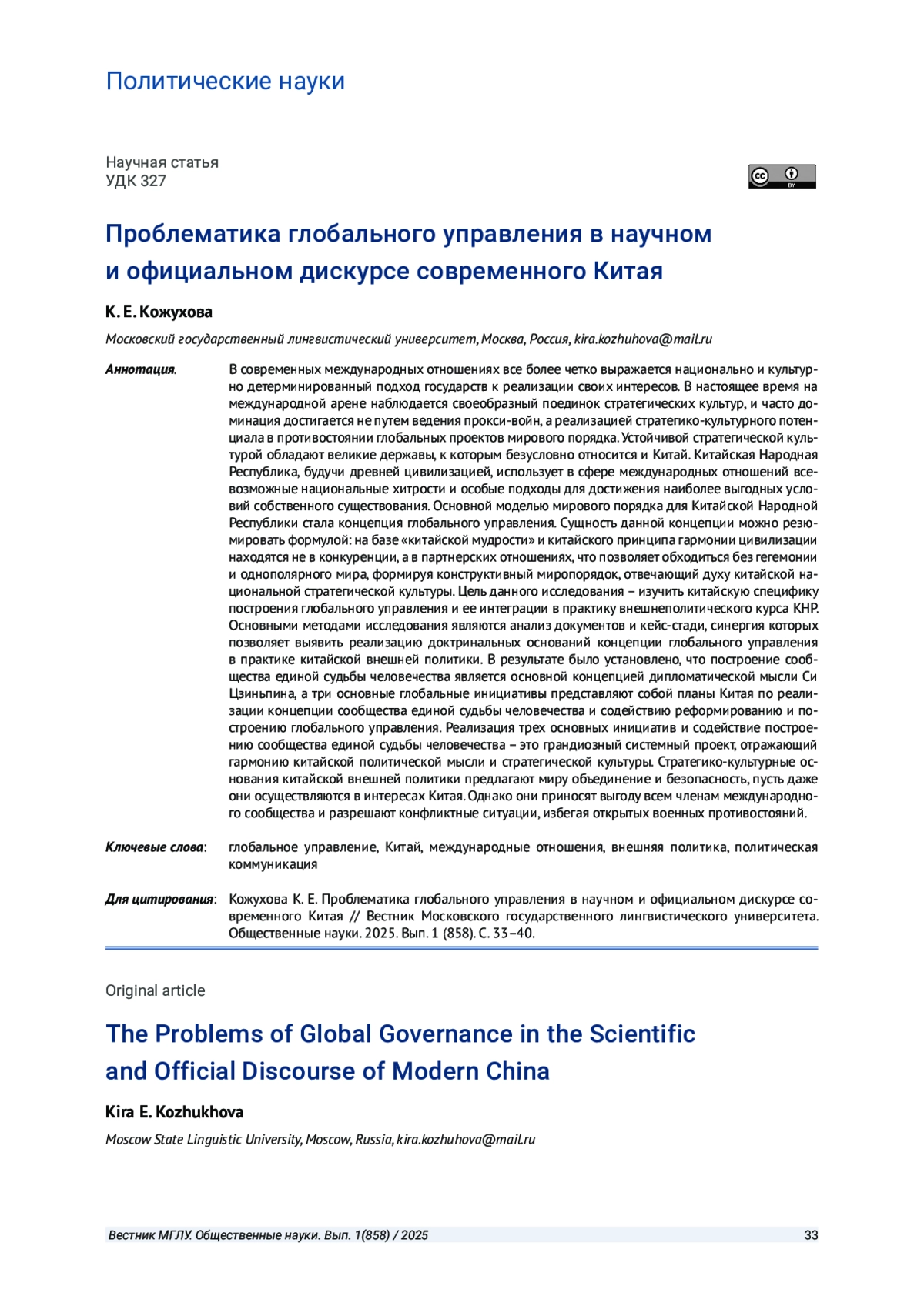 В современных международных отношениях все более четко выражается национально и культурно детерминированный подход государств к реализации своих интересов. В настоящее время на международной арене наблюдается своеобразный поединок стратегических культур, и часто доминация достигается не путем ведения прокси-войн, а реализацией стратегико-культурного потенциала в противостоянии глобальных проектов мирового порядка. Устойчивой стратегической культурой обладают великие державы, к которым безусловно относится и Китай. Китайская Народная Республика, будучи древней цивилизацией, использует в сфере международных отношений всевозможные национальные хитрости и особые подходы для достижения наиболее выгодных условий собственного существования. Основной моделью мирового порядка для Китайской Народной Республики стала концепция глобального управления. Сущность данной концепции можно резюмировать формулой: на базе «китайской мудрости» и китайского принципа гармонии цивилизации находятся не в конкуренции, а в партнерских отношениях, что позволяет обходиться без гегемонии и однополярного мира, формируя конструктивный миропорядок, отвечающий духу китайской национальной стратегической культуры. Цель данного исследования - изучить китайскую специфику построения глобального управления и ее интеграции в практику внешнеполитического курса КНР. Основными методами исследования являются анализ документов и кейс-стади, синергия которых позволяет выявить реализацию доктринальных оснований концепции глобального управления в практике китайской внешней политики. В результате было установлено, что построение сообщества единой судьбы человечества является основной концепцией дипломатической мысли Си Цзиньпина, а три основные глобальные инициативы представляют собой планы Китая по реализации концепции сообщества единой судьбы человечества и содействию реформированию и построению глобального управления. Реализация трех основных инициатив и содействие построению сообщества единой судьбы человечества - это грандиозный системный проект, отражающий гармонию китайской политической мысли и стратегической культуры. Стратегико-культурные основания китайской внешней политики предлагают миру объединение и безопасность, пусть даже они осуществляются в интересах Китая. Однако они приносят выгоду всем членам международного сообщества и разрешают конфликтные ситуации, избегая открытых военных противостояний.