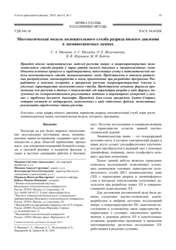 Микаева С. А., Микаева А. С., Железникова О. Е., Муравьев В. В., Бойчук М. И. Математическая модель положительного столба разряда низкого давления в люминесцентных лампах 33