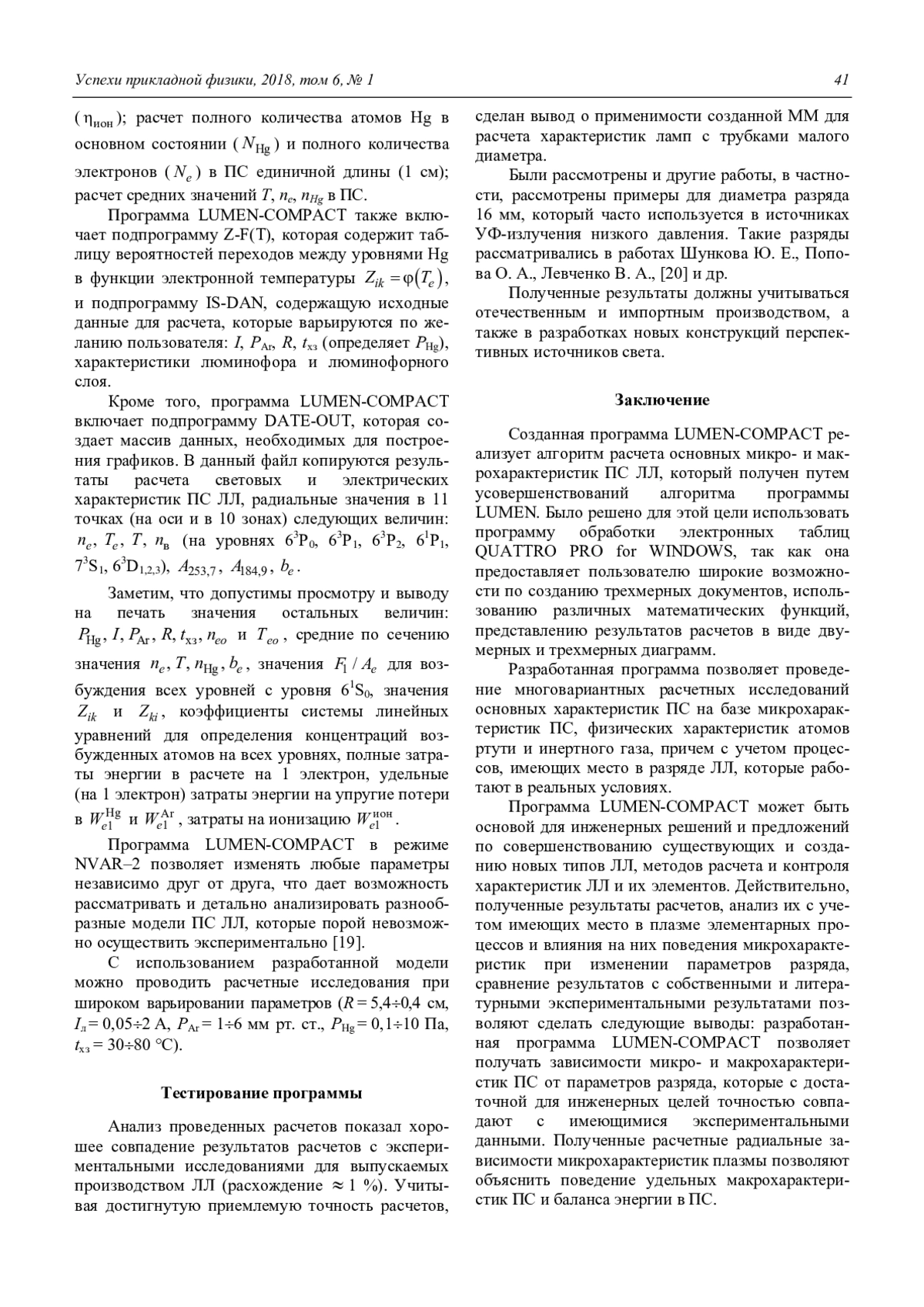 Созданная программа LUMEN-COMPACT реализует алгоритм расчета основных микро- и макрохарактеристик ПС ЛЛ, который получен путем усовершенствований алгоритма программы LUMEN. Было решено для этой цели использовать программу обработки электронных таблиц QUATTRO PRO for WINDOWS, так как она предоставляет пользователю широкие возможности по созданию трехмерных документов, использованию различных математических функций, представлению результатов расчетов в виде двумерных и трехмерных диаграмм. Разработанная программа позволяет проведение многовариантных расчетных исследований основных характеристик ПС на базе микрохарактеристик ПС, физических характеристик атомов ртути и инертного газа, причем с учетом процессов, имеющих место в разряде ЛЛ, которые работают в реальных условиях. Программа LUMEN-COMPACT может быть основой для инженерных решений и предложений по совершенствованию существующих и созданию новых типов ЛЛ, методов расчета и контроля характеристик ЛЛ и их элементов. Действительно, полученные результаты расчетов, анализ их с учетом имеющих место в плазме элементарных процессов и влияния на них поведения микрохарактеристик при изменении параметров разряда, сравнение результатов с собственными и литературными экспериментальными результатами позволяют сделать следующие выводы: разработанная программа LUMEN-COMPAСT позволяет получать зависимости микро- и макрохарактеристик ПС от параметров разряда, которые с достаточной для инженерных целей точностью совпадают с имеющимися экспериментальными данными. Полученные расчетные радиальные зависимости микрохарактеристик плазмы позволяют объяснить поведение удельных макрохарактеристик ПС и баланса энергии в ПС.