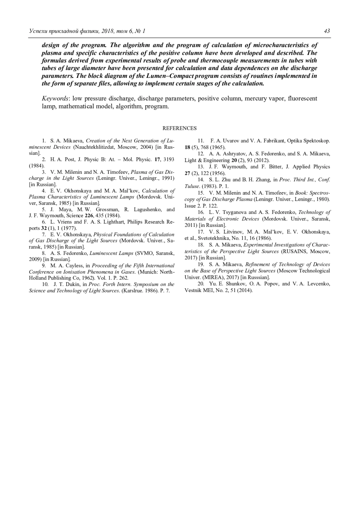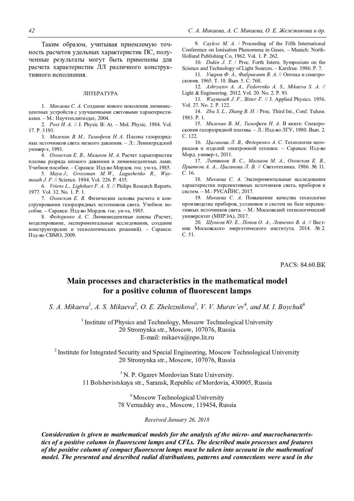 S. A. Mikaeva, A. S. Mikaeva, O. E. Zheleznikova, V. V. Murav’ev, and M. I. Boychuk Main processes and characteristics in the mathematical model for a positive column of fluorescent lamps 33