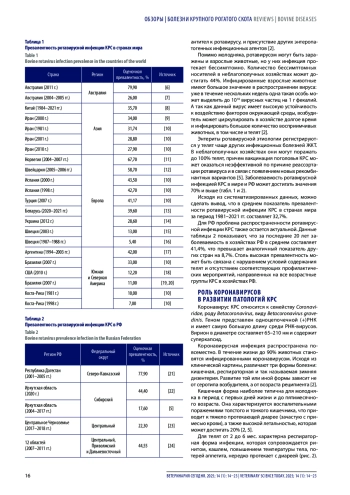 Заключение. Средний уровень заболеваемости ротавирусной инфекцией в мире составляет 32,7%, коронавирусной инфекцией – 18,4%, колибактериозом – 39,1%. В России показатель превалентности вышеупомянутых болезней равен 41,4; 33,1 и 30,2% соответственно. Таким образом, в Российской Федерации уровень заболеваемости рота- и коронавирусной инфекциями крупного рогатого скота превышает средний показатель в мире на 8,7 и 14,7% соответственно. Эпизоотическая ситуация по колибактериозу в России благополучнее, чем в большинстве стран: болезнь регистрируется реже среднего мирового значения на 8,9%. Большое генетическое разнообразие и распространенность вышеупомянутых возбудителей требуют комплексного подхода для борьбы с ними. Одним из наиболее эффективных способов является вакцинопрофилактика, что делает разработку эффективных и безопасных вакцинных препаратов против ротавирусной, коронавирусной инфекций и эшерихиоза актуальной задачей.