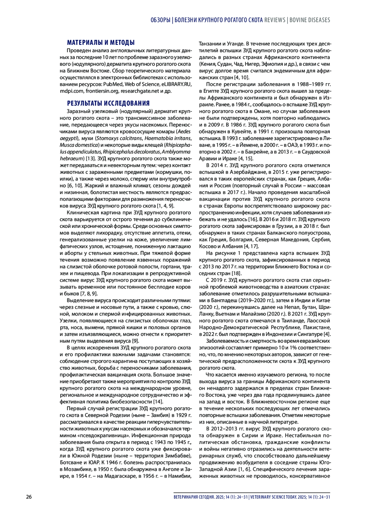 Заключение. Определена роль Ближневосточного региона в распространении возбудителя болезни, названы вероятные причины неблагополучия региона по данному заболеванию, сформулировано направление дальнейших действий в рамках борьбы с заразным узелковым дерматитом крупного рогатого скота.