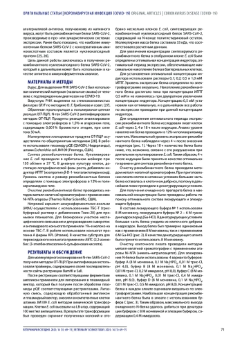 Заключение. Получение рекомбинантного нуклеокапсидного белка SARS-CoV-2 в высокой концентрации позволит в перспективе использовать его в качестве антигена при разработке иммуноферментной тест-системы для выявления антител к нуклеокапсидному белку SARS-CoV-2 в сыворотках крови животных.