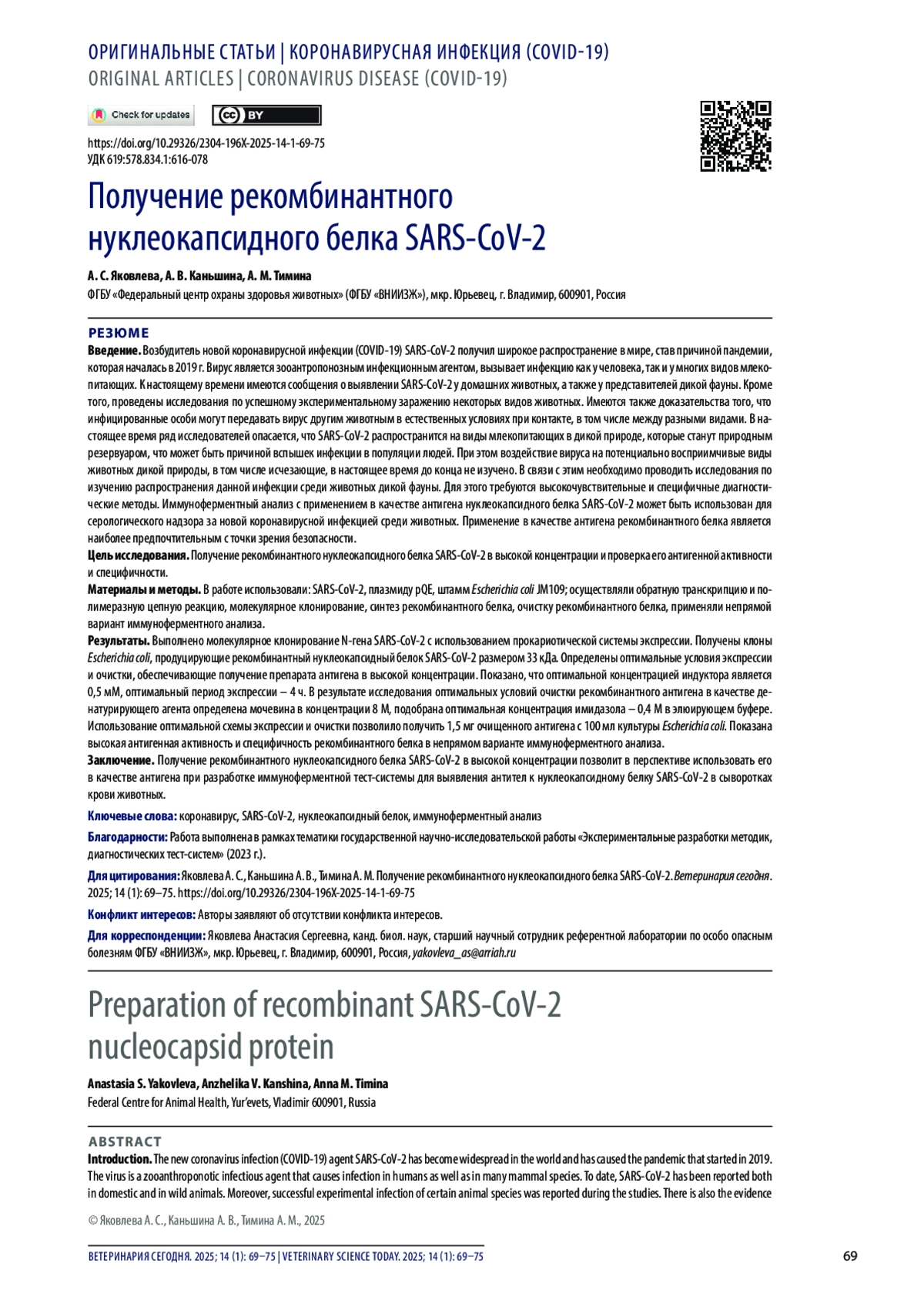Введение. Возбудитель новой коронавирусной инфекции (COVID-19) SARS-CoV-2 получил широкое распространение в мире, став причиной пандемии, которая началась в 2019 г. Вирус является зооантропонозным инфекционным агентом, вызывает инфекцию как у человека, так и у многих видов млекопитающих. К настоящему времени имеются сообщения о выявлении SARS-CoV-2 у домашних животных, а также у представителей дикой фауны. Кроме того, проведены исследования по успешному экспериментальному заражению некоторых видов животных. Имеются также доказательства того, что инфицированные особи могут передавать вирус другим животным в естественных условиях при контакте, в том числе между разными видами. В настоящее время ряд исследователей опасается, что SARS-CoV-2 распространится на виды млекопитающих в дикой природе, которые станут природным резервуаром, что может быть причиной вспышек инфекции в популяции людей. При этом воздействие вируса на потенциально восприимчивые виды животных дикой природы, в том числе исчезающие, в настоящее время до конца не изучено. В связи с этим необходимо проводить исследования по изучению распространения данной инфекции среди животных дикой фауны. Для этого требуются высокочувствительные и специфичные диагностические методы. Иммуноферментный анализ с применением в качестве антигена нуклеокапсидного белка SARS-CoV-2 может быть использован для серологического надзора за новой коронавирусной инфекцией среди животных. Применение в качестве антигена рекомбинантного белка является наиболее предпочтительным с точки зрения безопасности.