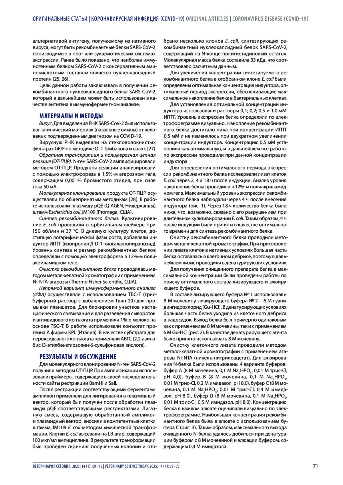 Результаты. Выполнено молекулярное клонирование N-гена SARS-CoV-2 с использованием прокариотической системы экспрессии. Получены клоны Escherichia coli, продуцирующие рекомбинантный нуклеокапсидный белок SARS-CoV-2 размером 33 кДа. Определены оптимальные условия экспрессии и очистки, обеспечивающие получение препарата антигена в высокой концентрации. Показано, что оптимальной концентрацией индуктора является 0,5 мМ, оптимальный период экспрессии – 4 ч. В результате исследования оптимальных условий очистки рекомбинантного антигена в качестве денатурирующего агента определена мочевина в концентрации 8 М, подобрана оптимальная концентрация имидазола – 0,4 М в элюирующем буфере. Использование оптимальной схемы экспрессии и очистки позволило получить 1,5 мг очищенного антигена с 100 мл культуры Escherichia coli. Показана высокая антигенная активность и специфичность рекомбинантного белка в непрямом варианте иммуноферментного анализа.