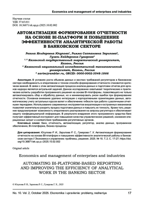 В условиях роста объемов данных и жестких требований регуляторов в банковском секторе необходимость в оперативном и точном способе формирования отчетности становится критически важной. В связи с этим автоматизация процесса анализа данных и подготовки отчетов для органов надзора является актуальной задачей. Данное исследование охватывает теоретические и практические аспекты разработки программного решения на основе BI-платформы, позволяющего не только автоматизировать сбор и обработку данных, но и минимизировать риски ошибок при формировании отчетности. Основное внимание уделено интеграции с корпоративными хранилищами данных, автоматическому учету актуальных курсов валют и обеспечению гибкости при работе с различными отчетными периодами. Использование современных инструментов визуализации и встроенных механизмов позволяет значительно ускорить процесс подготовки данных и повысить их точность. Кроме того, решение предусматривает возможность оперативного реагирования на запросы регулятора и обеспечивает защиту конфиденциальной информации. В результате внедрения этого программного средства банк получает эффективный инструмент для повышения качества управленческих решений, снижения операционных затрат и соответствия требованиям регулятивных органов.
