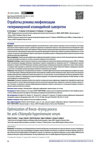 Заключение. В результате проведенной работы был отработан оптимальный режим лиофилизации специфической хламидийной сыворотки для диагностической тест-системы. Полученный препарат полностью соответствует характеристикам, заявленным в технических условиях на диагностикум. Установлено, что длительность хранения лиофилизированной сыворотки составляет не менее двух лет, в течение данного периода ее активность и физико-химические свойства не снижаются.