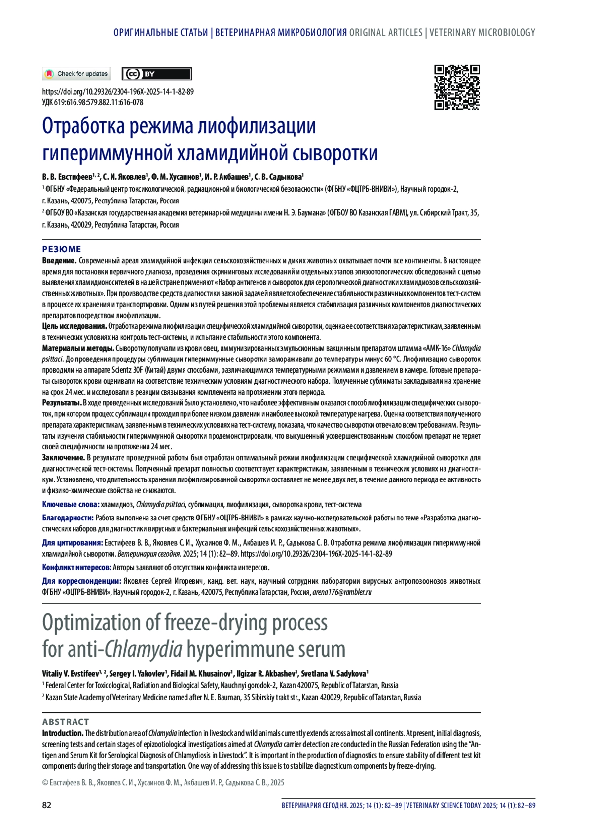 Цель исследования. Отработка режима лиофилизации специфической хламидийной сыворотки, оценка ее соответствия характеристикам, заявленным в технических условиях на контроль тест-системы, и испытание стабильности этого компонента.