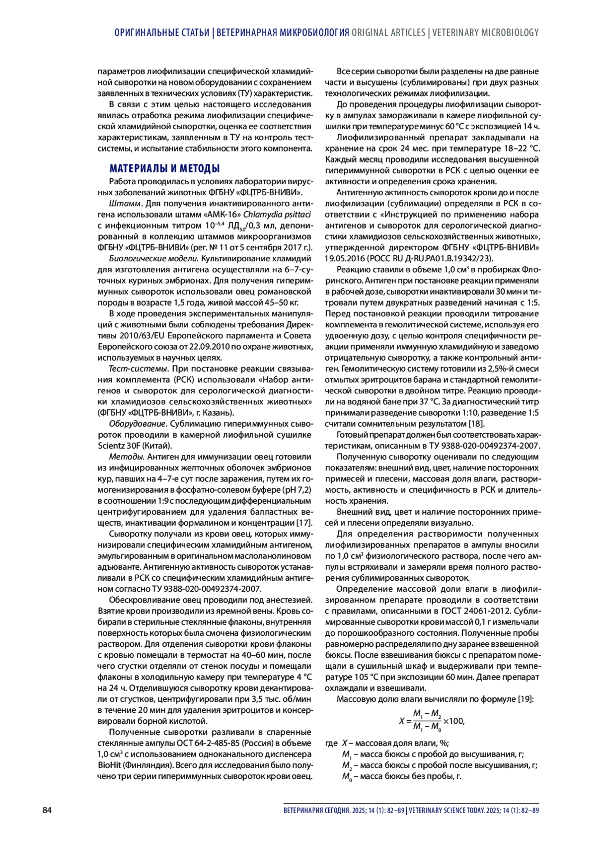 Введение. Современный ареал хламидийной инфекции сельскохозяйственных и диких животных охватывает почти все континенты. В настоящее время для постановки первичного диагноза, проведения скрининговых исследований и отдельных этапов эпизоотологических обследований с целью выявления хламидионосителей в нашей стране применяют «Набор антигенов и сывороток для серологической диагностики хламидиозов сельскохозяйственных животных». При производстве средств диагностики важной задачей является обеспечение стабильности различных компонентов тест-систем в процессе их хранения и транспортировки. Одним из путей решения этой проблемы является стабилизация различных компонентов диагностических препаратов посредством лиофилизации.