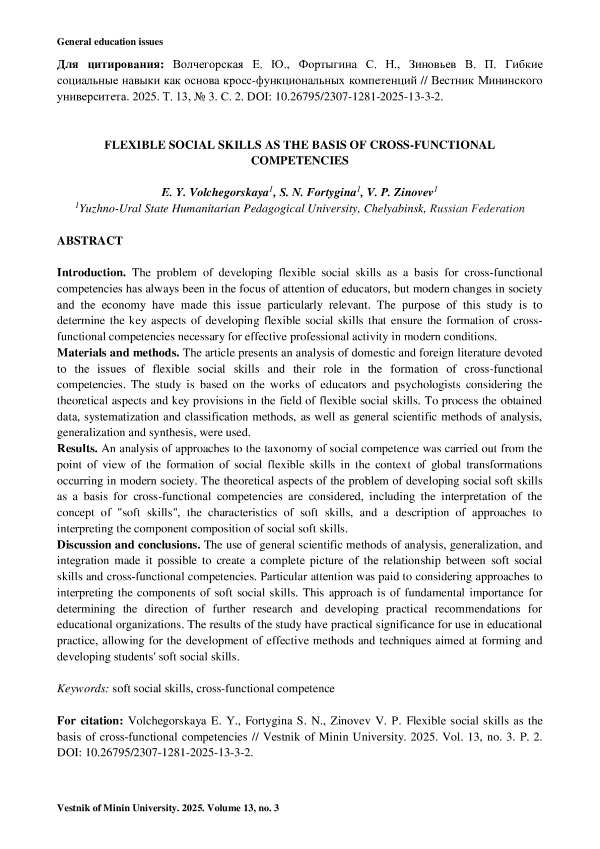 Материалы и методы. В статье представлен анализ отечественной и зарубежной литературы, посвящённой вопросам гибких социальных навыков и их роли в формировании кросс-функциональных компетенций. Основу исследования составили труды педагогов и психологов, рассматривающие теоретические аспекты и ключевые положения в области гибких социальных навыков. Для обработки полученных данных были применены методы систематизации и классификации, а также общенаучные методы анализа, обобщения и синтеза.