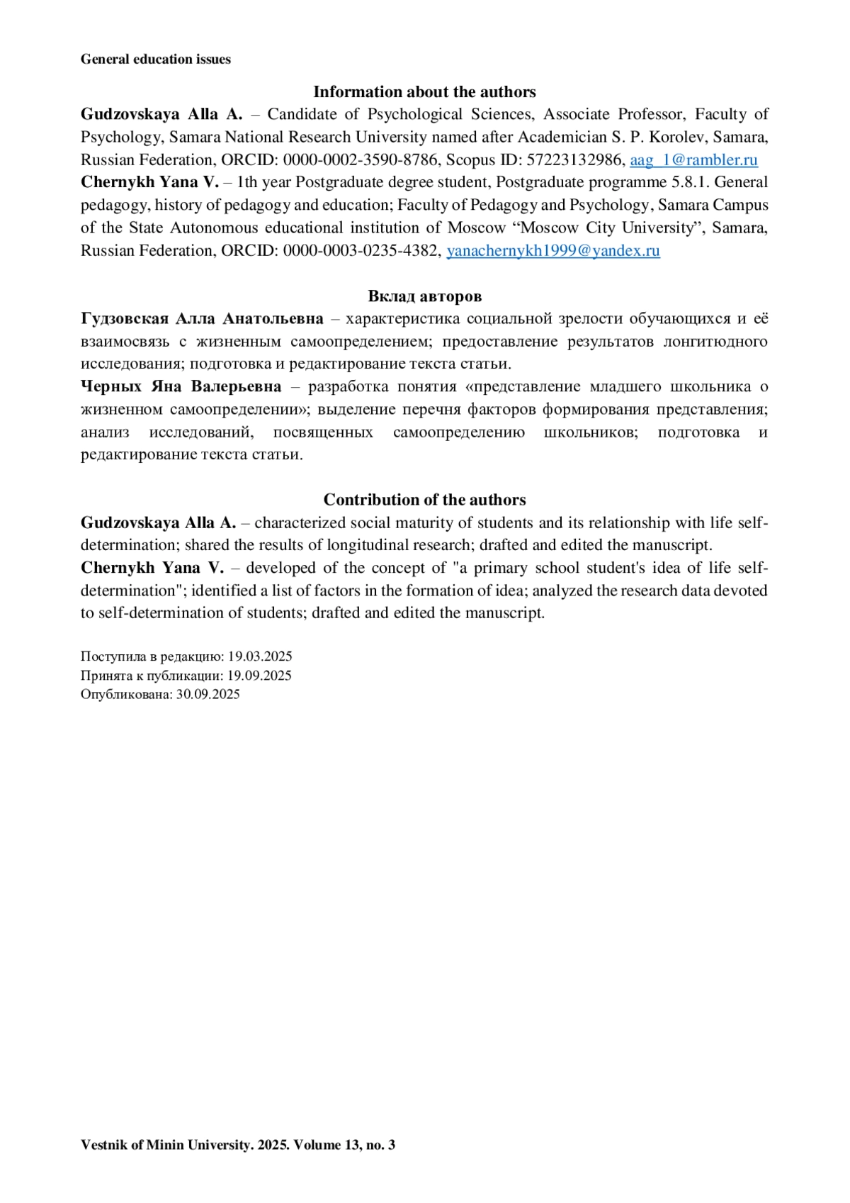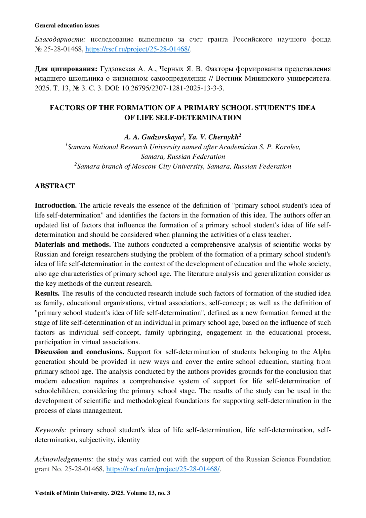 Введение. В статье раскрывается сущность понятия «представление младшего школьника о жизненном самоопределении», обозначены факторы формирования данного представления. Авторы предлагают обновленный перечень факторов, которые влияют на представление младшего школьника о жизненном самоопределении и должны быть учтены в планировании деятельности классного руководителя.