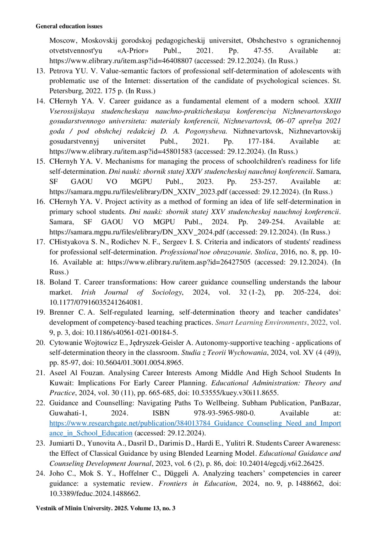 15. Черных Я. В. Механизмы управления процессом готовности школьников к жизненному самоопределению // Дни науки: сборник статей XXIV студенческой научной конференции. Самара: СФ ГАОУ ВО МГПУ, 2023. С. 253-257. URL: https://samara.mgpu.ru/files/elibrary/DN_XXIV_2023.pdf (дата обращения: 29.12.2024).