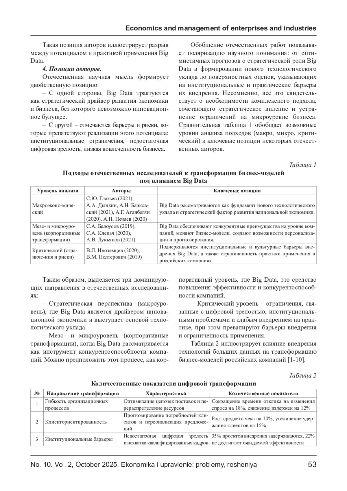 Статья посвящена анализу трансформации бизнес-моделей под воздействием технологий больших данных в современной экономике. Рассматриваются теоретико-методологические основы применения больших данных, их влияние на стратегическое управление предприятиями и институциональные ограничения цифровой модернизации. Особое внимание уделено вопросам адаптации традиционных моделей бизнеса к новым технологическим условиям и выявлению рисков цифровизации. В табличном виде обобщены количественные показатели, иллюстрирующие влияние внедрения технологий больших данных на трансформацию бизнес-моделей российских компаний. Внедрение технологий больших данных характеризует положительный эффект ключевых параметров бизнес-моделей российских компаний: ускорение процессов, рост доходности и увеличение доли новых продуктов в выручке. На основании анализа отечественных исследований выявлены ключевые направления изменений, включая повышение гибкости бизнес-процессов, интеграцию аналитических инструментов и усиление клиентоориентированности.